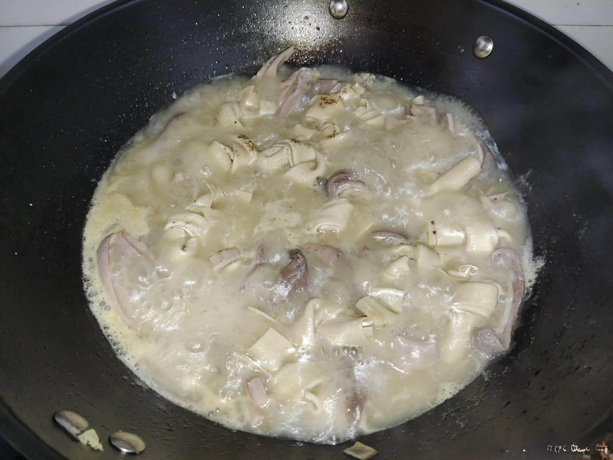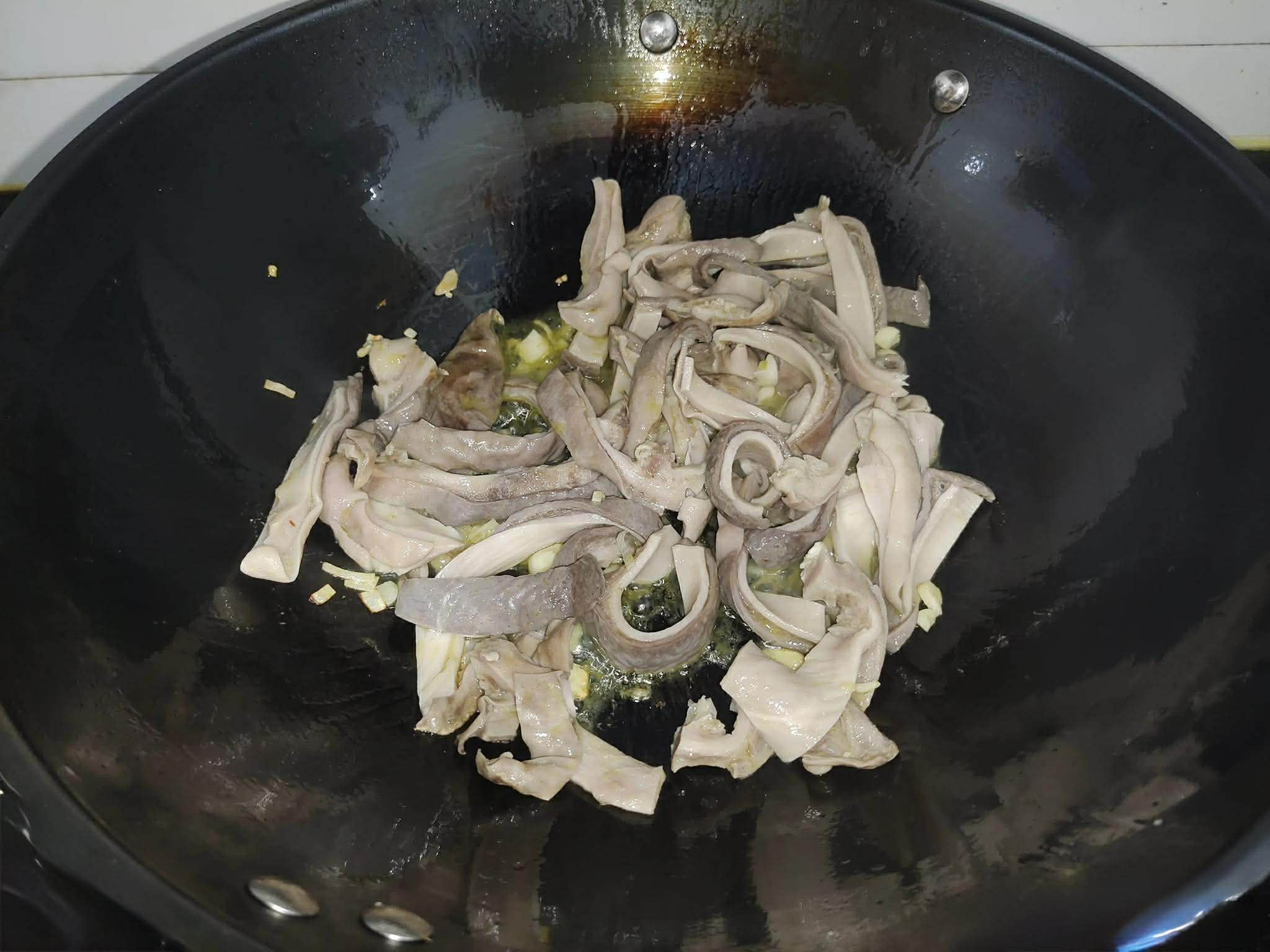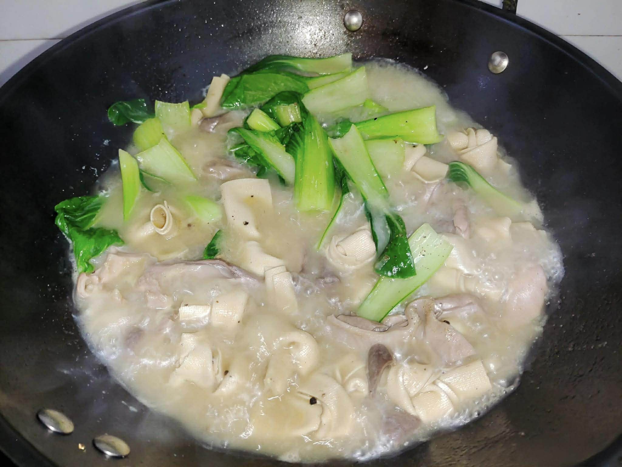 Bước 3: Đặt chảo lên bếp, đun nóng. Sau đó thêm một chút dầu vào và đun nóng thêm. Tiếp đó bạn cho dạ dày heo đã thái miếng vào, xào sơ. Sau đó, cho thêm một số gia vị như gốc hành lá băm nhỏ, gừng và tỏi băm vào xào cùng. Sau đó đổ phần nước luộc dạ dày vào. Sau khi đun sôi nước trên lửa lớn, cho váng đậu cuộn vào nồi. Nêm nếm một ít tiêu trắng, muối và một chút tinh chất cốt gà. Đậy nắp và nấu khoảng 10 phút. Cuối cùng, cho rau vào nồi, ấn xuống, đun thêm một lúc cho rau chín rồi rắc thêm một ít tiêu bột hoặc tiêu xay thô để dậy mùi thơm.