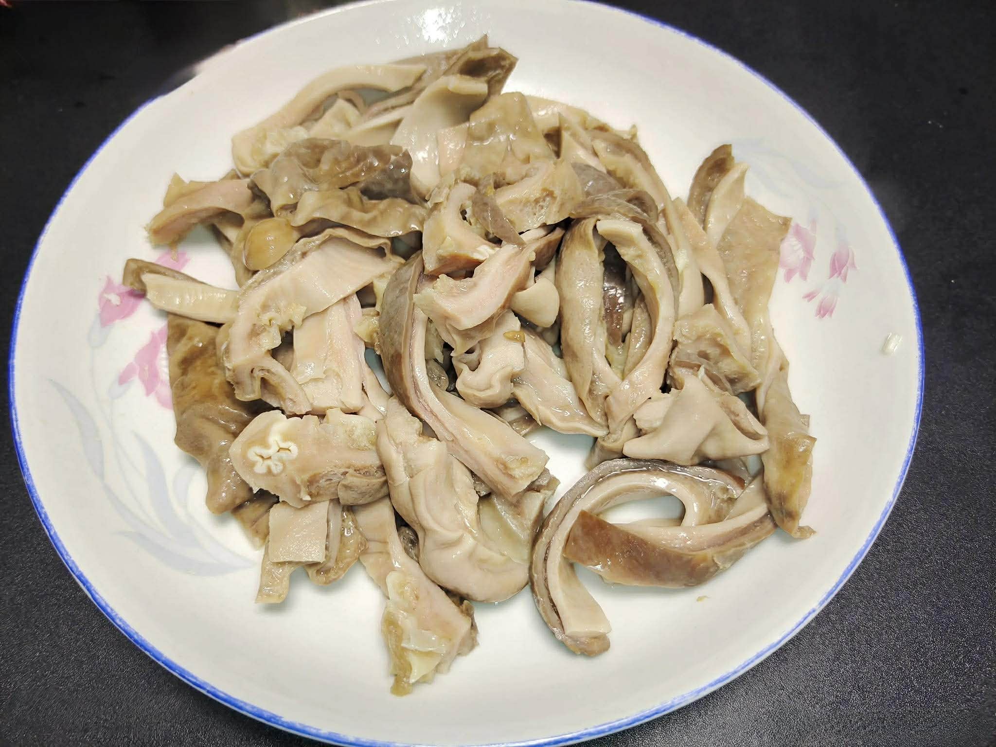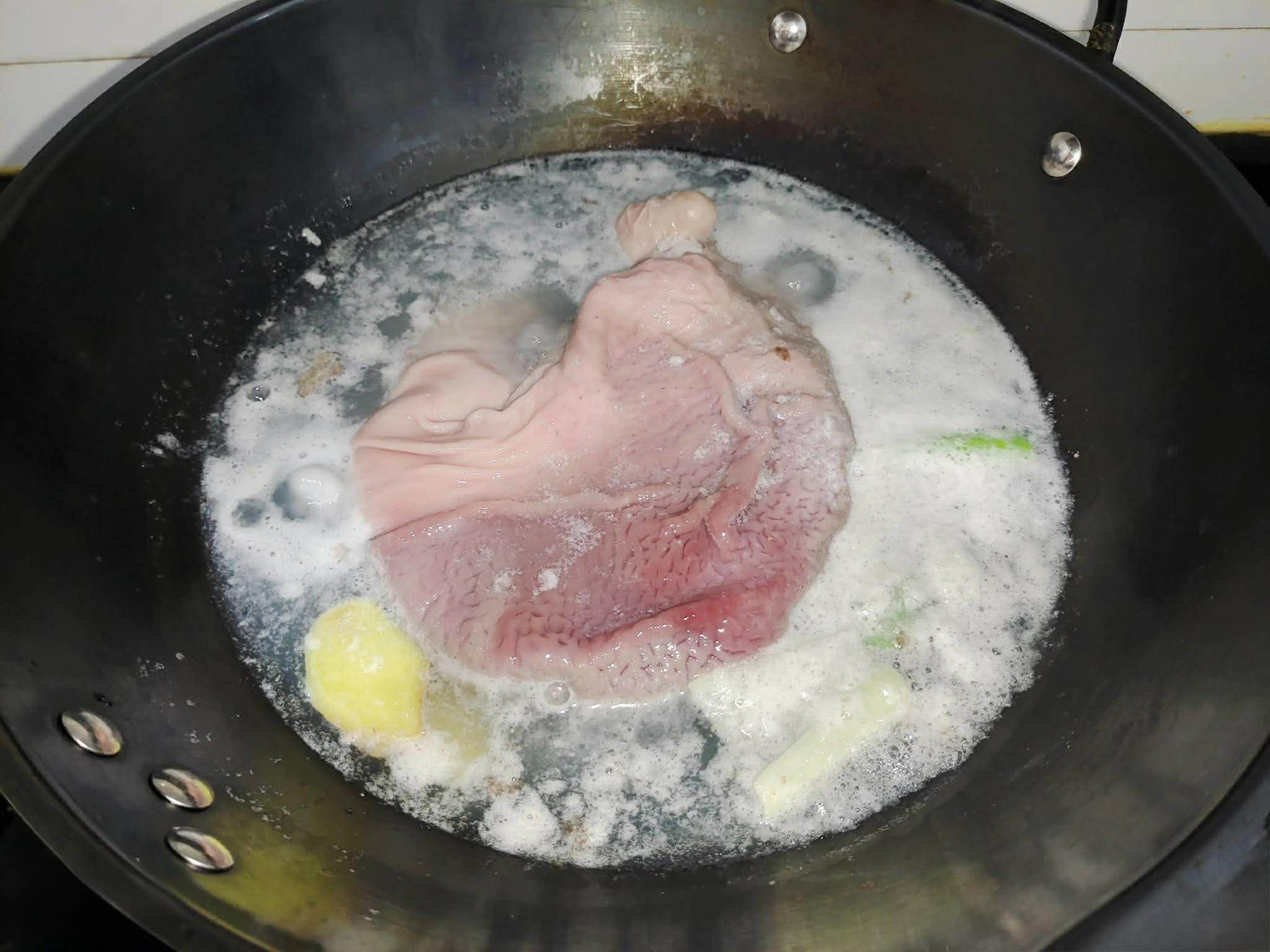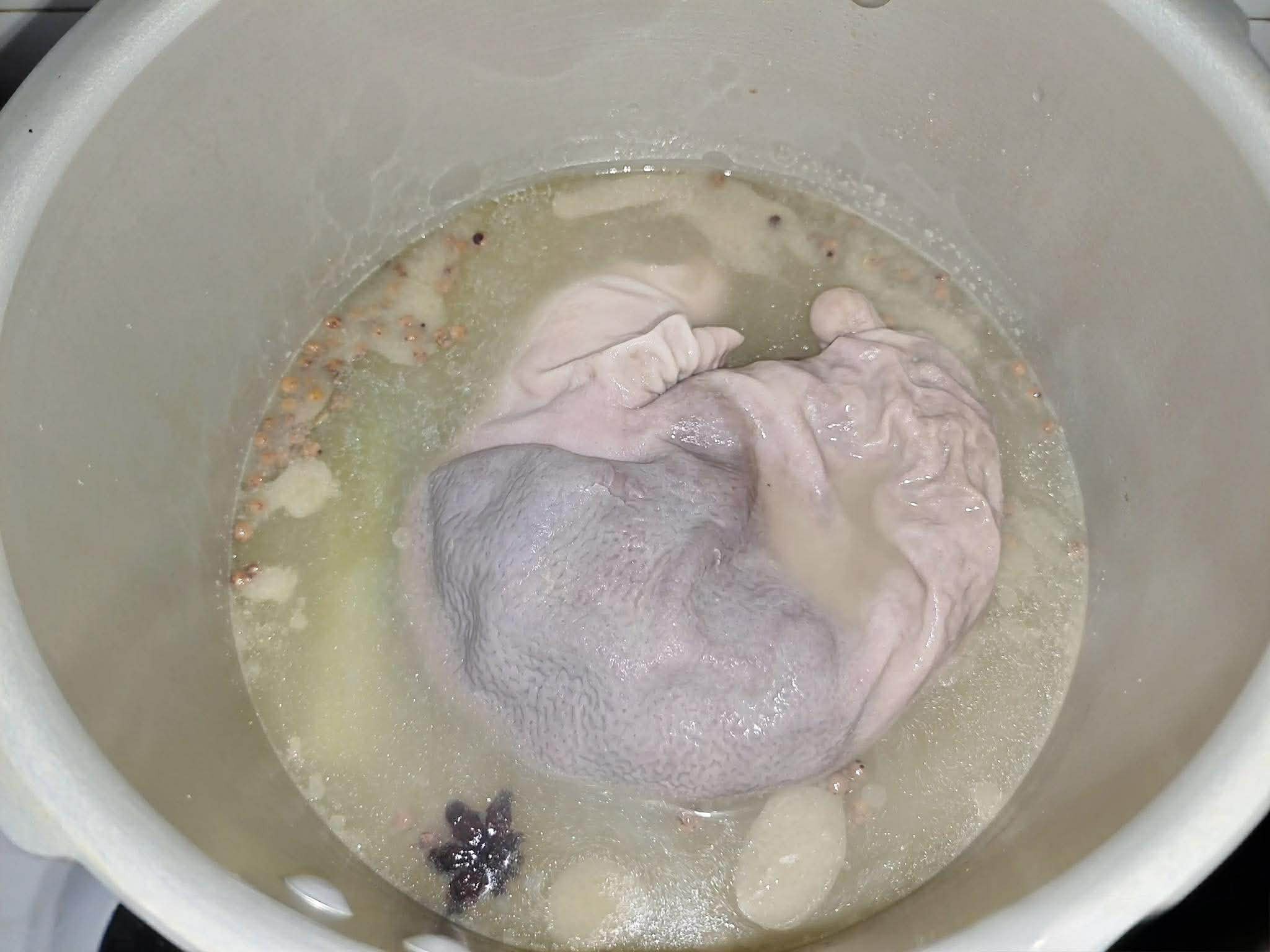 Bước 2: Cho dạ dày heo đã chần vào nồi áp suất, thêm lượng nước vừa đủ, một ít hạt tiêu nguyên hạt khô và hoa hồi, cùng với hành lá và gừng. Đậy nắp và đun sôi trên lửa lớn cho đến khi nồi áp suất đẩy hơi. Nấu trong 20 phút, sau đó tắt bếp. Sau khi xả hết áp suất, vớt dạ dày heo ra và cắt thành từng dải. Không nên bỏ phần nước luộc; phần nước dùng này sẽ được cho lại vào nồi sau.