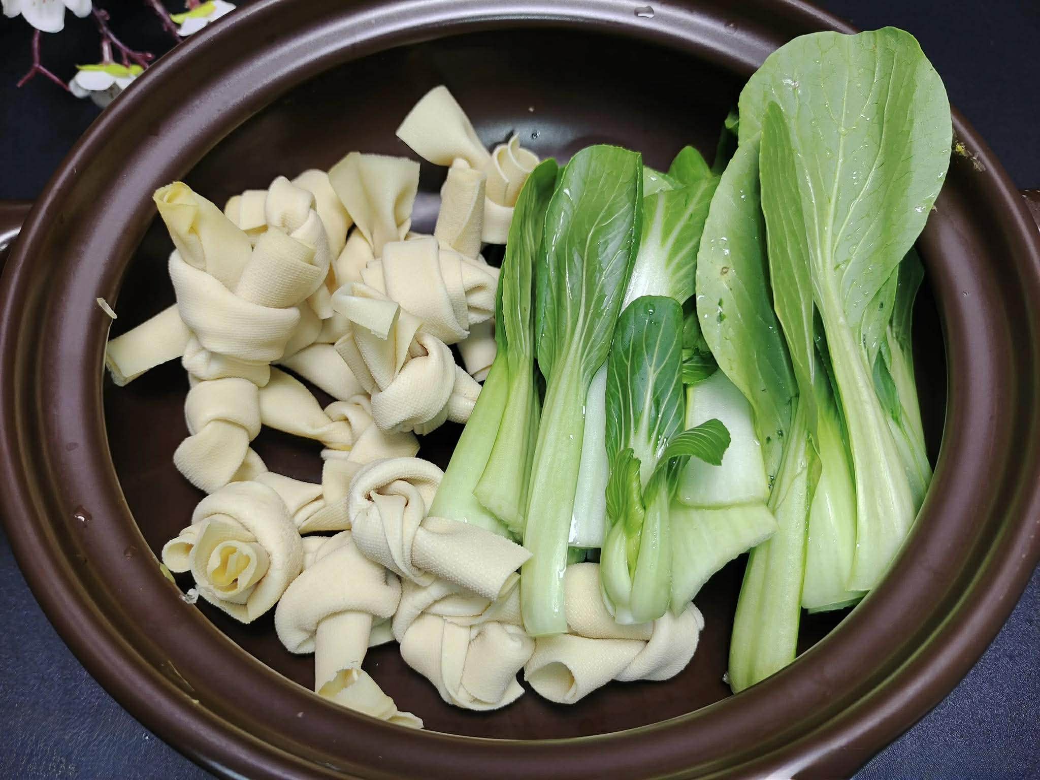 Bước 1: Trước tiên, chuẩn bị các cuộn váng đậu. Rất đơn giản, bạn haỹ cắt váng đậu (tươi hoặc đã ngâm mềm) thành những dải vừa ăn sau đó cuộn lại rồi buộc nút. Tiếp theo, tách lá của 2 cây cải thìa, rửa sạch và để riêng. Phần quan trọng nhất, tất nhiên, là sơ chế dạ dày. Dạ dày cần phải được nhào với thật nhiều tinh bột và nhiều muối để loại bỏ chất nhầy bên trong. Sau khi rửa sạch, xả lại với nước sạch, cho vào nồi nước lạnh, thêm một ít rượu nấu ăn, hành lá và gừng thái lát, rồi chần trên lửa lớn trong 5 phút. Sau đó, vớt ra và xả lại với nước ấm.