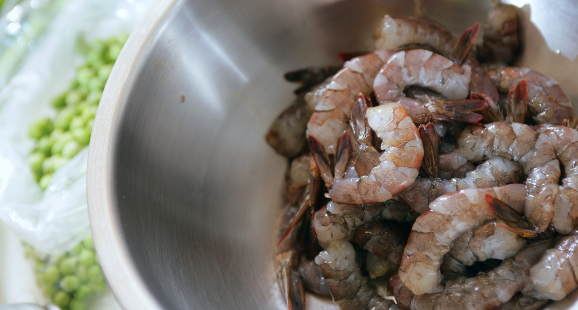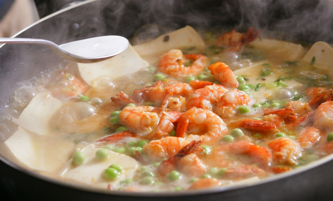 Nguyên liệu: 1 miếng đậu hũ non, 10 con tôm lớn (hoặc 20 con tôm nhỏ), nửa cây cải thảo, 2 lát gừng, một ít hành lá thái nhỏ, 1 muỗng canh nước tương, một chút muối, một ít hạt đậu Hà Lan, một nhúm tiêu trắng, nửa muỗng canh bột bắp pha nước, dầu oliu.