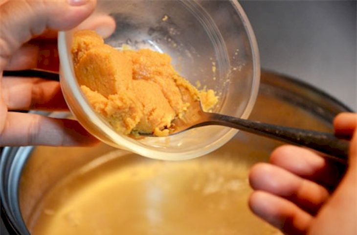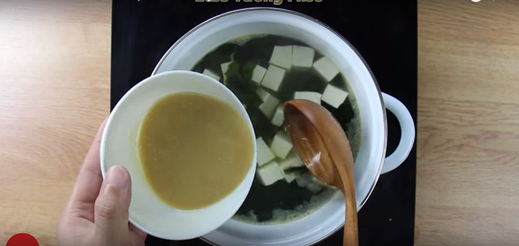 Bước 2: Cho đậu phụ cắt khối và rong biển wakame đã ngâm vào, tiếp tục đun nhỏ lửa trong 2 phút. Không nên dùng lửa lớn để nấu nhanh, nếu không đậu phụ sẽ bị dai và mất độ mềm. Cho 1 muỗng miso vào một bát sạch, múc một ít nước dùng nóng từ nồi để hòa tan miso, sau đó đổ lại vào nồi và khuấy đều. Cách này giúp tránh việc nấu chín trực tiếp miso và làm mất đi hương vị cũng như chất dinh dưỡng của nó. Tắt bếp, rắc hành lá thái nhỏ đã chuẩn bị lên trên và dùng ngay.