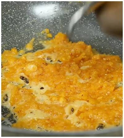 Bước 1: Cắt đậu phụ non thành từng miếng vuông nhỏ và ngâm trong nước muối loãng khoảng 10 phút để tránh bị nát và khử mùi tanh. Gọt vỏ mướp, cắt thành từng miếng nhỏ và ngâm trong nước muối loãng để tránh bị oxy hóa và chuyển sang màu đen. Dùng thìa nghiền nhuyễn lòng đỏ trứng muối đã hấp thành hỗn hợp mịn. Cho một ít dầu vào chảo, phi thơm tỏi băm, sau đó cho hỗn hợp lòng đỏ trứng muối vào xào nhỏ lửa cho đến khi sôi sủi bọt và có dạng bột.