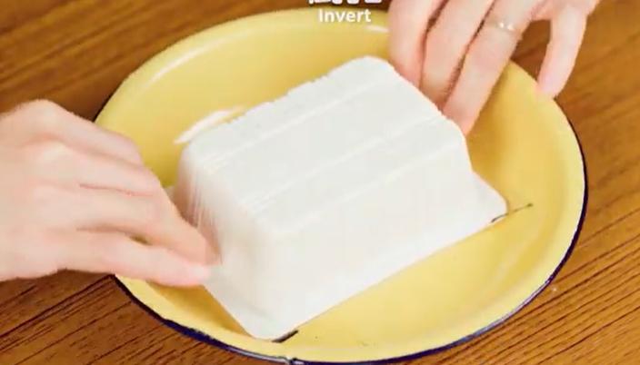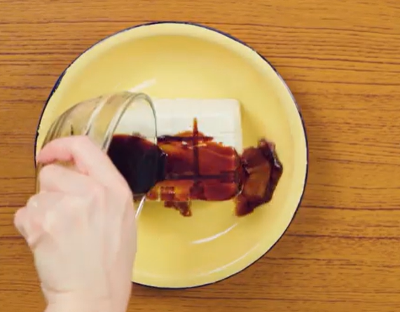 Bước 1: Cắt 4 góc của hộp đậu phụ non rồi bóc lớp nắp nilon sau đó úp ngược đậu phụ non lên một chiếc đĩa sạch. Việc cắt các lỗ nhỏ ở góc đáy hộp sẽ giúp lấy đậu ra khỏi khay đựng dễ dàng và nguyên vẹn. Dùng dao thái nhẹ đậu phụ thành những lát dày đều nhau. Để yên trong 2 phút rồi chắt bỏ nước. Tiếp theo cho nước tương, giấm balsamic, dầu hào, đường không calo và nước đun sôi để nguội vào bát, khuấy đều để tạo thành nước sốt sánh mịn.