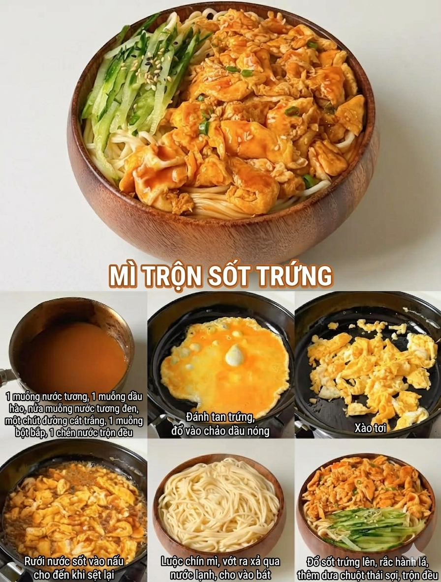 Mì trộn sốt trứng là món ăn khoái khẩu của các thành viên trong gia đình tôi. Trứng vàng óng, được đánh bông xốp rồi chiên sau đó phủ một lớp nước sốt đậm đà, từng sợi mì thấm đẫm hương vị. Thêm vài lát dưa chuột bào sợi để tạo vị tươi mát và làm sạch vị giác. Công thức cực kỳ đơn giản: Bạn chỉ cần đánh trứng rồi chiên chín. Sau đó tách thành các miếng nhỏ, thêm sốt đã chuẩn bị và nấu đến khi sánh lại, đổ lên mì đã luộc chín, rắc hành lá thái nhỏ lên trên. Như vậy là chỉ trong vòng khoảng 15 phút là bạn đã có một bát mì ngon miệng và đẹp mắt đã sẵn sàng. Nhìn vẻ mặt mặt mãn nguyện các thành viên trong gia đình thưởng thức món mì này còn quý giá hơn bất kỳ món ăn ngon nào.