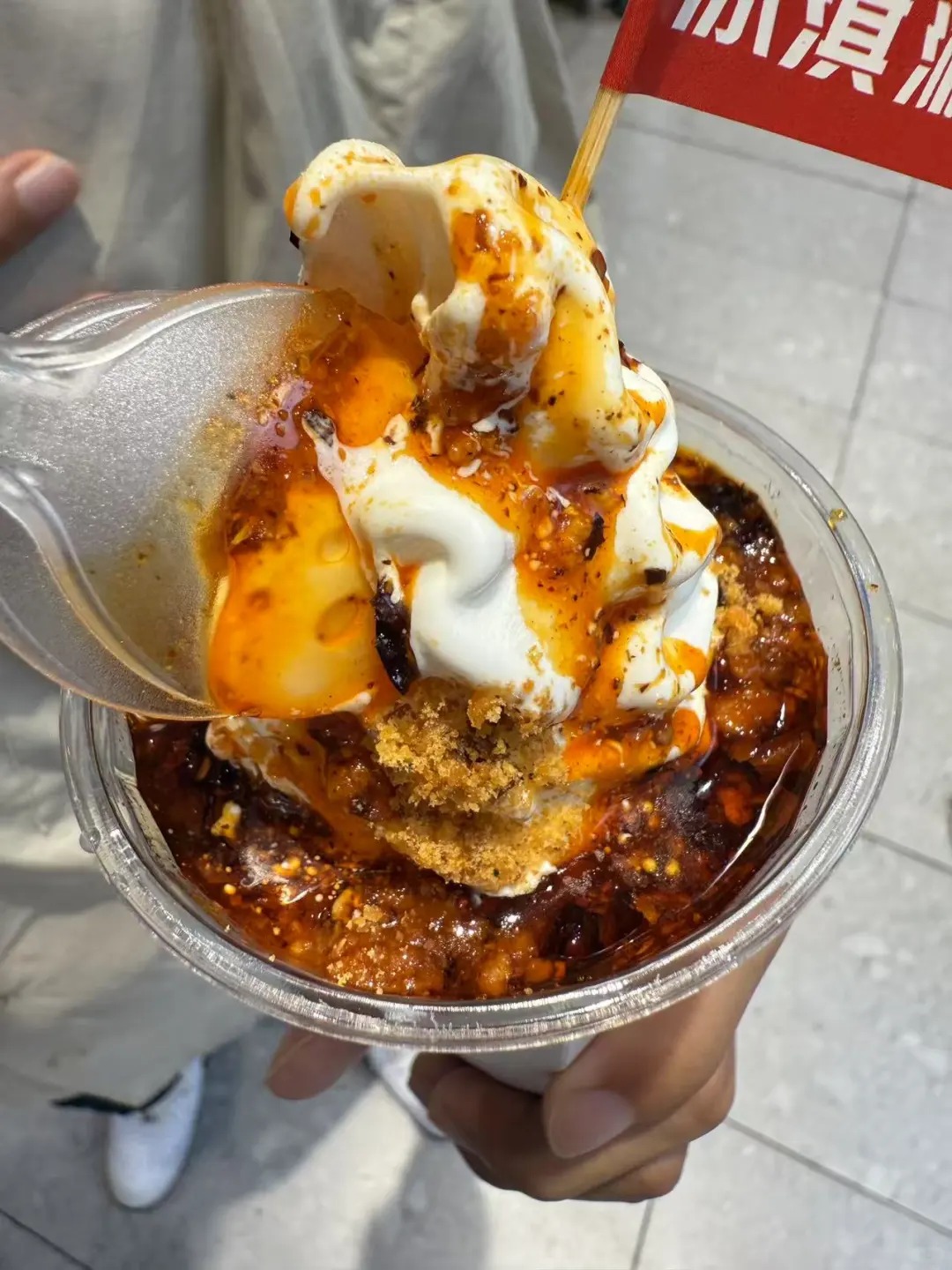 Dạo bước trên con phố ẩm thực Bát Nhất sầm uất bậc nhất Trùng Khánh, không khó để bạn bắt gặp những đám đông du khách hiếu kỳ đang vây quanh quầy bán món kem dầu ớt đỏ rực đầy thách thức này. Theo chân một vị khách du lịch dũng cảm vừa tậu cho mình một phần ăn thử với giá không hề rẻ, chúng ta mới thấy rõ độ bạo gan của người bán khi họ không ngần ngại múc một muỗng dầu ớt đặc sệt, lềnh bềnh hạt tiêu và ớt bột rưới thẳng lên lớp kem sữa tươi mát lạnh lấp lánh.