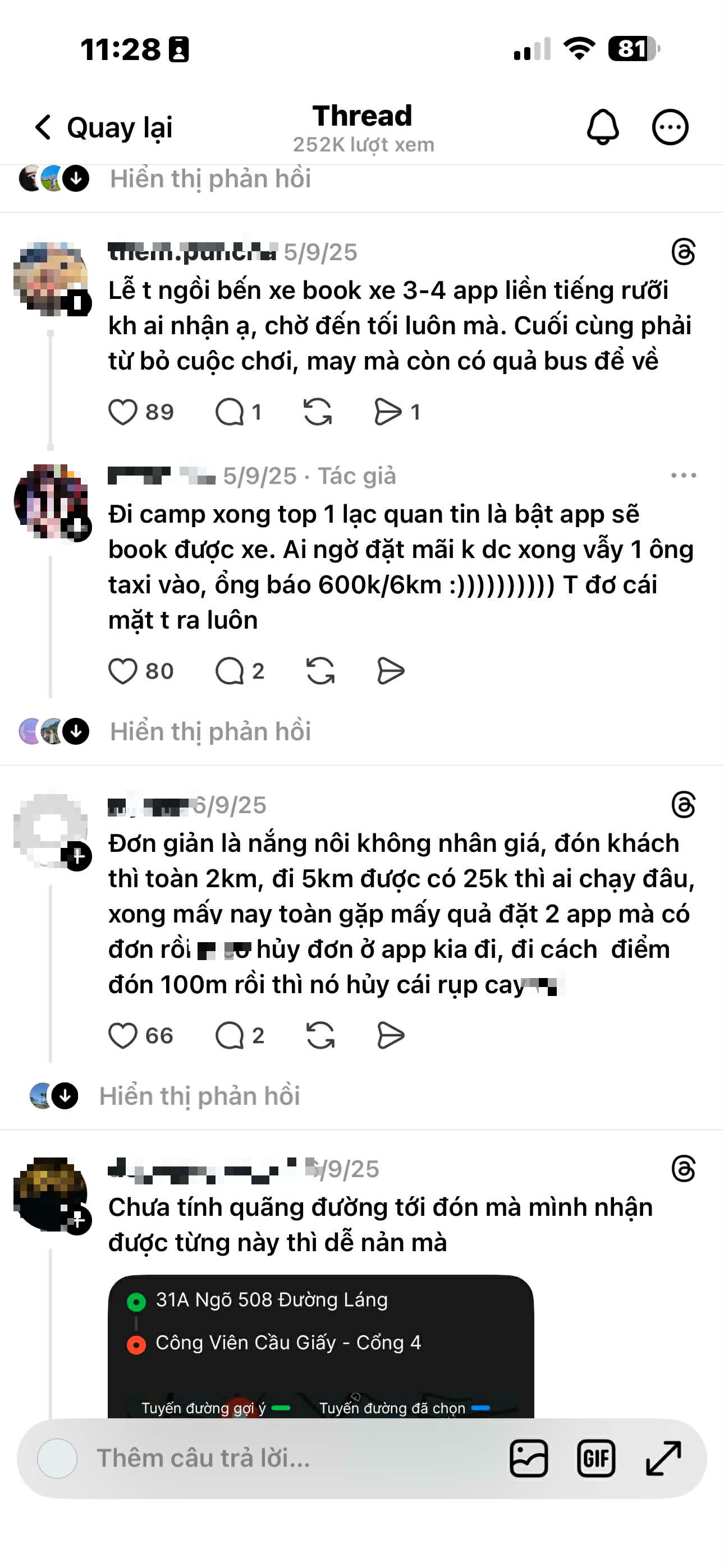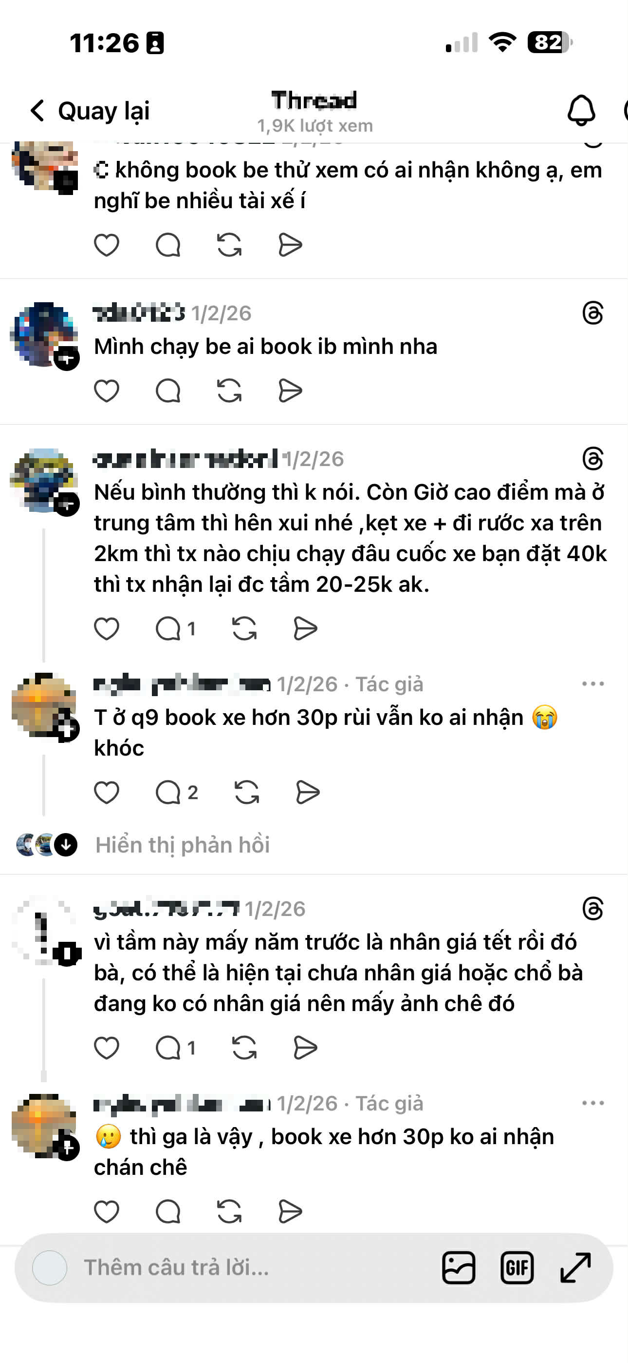 Thêm vào đó, áp lực về tỷ lệ nhận chuyến, tỷ lệ hủy chuyến cùng mức chiết khấu cao cũng là rào cản khiến nhiều tài xế trở nên "kén cá chọn canh" hơn. Họ buộc phải tính toán kỹ lưỡng để đảm bảo thu nhập ngày Tết, dẫn đến tình trạng khách thì nhiều mà xe thì "bóng chim tăm cá".