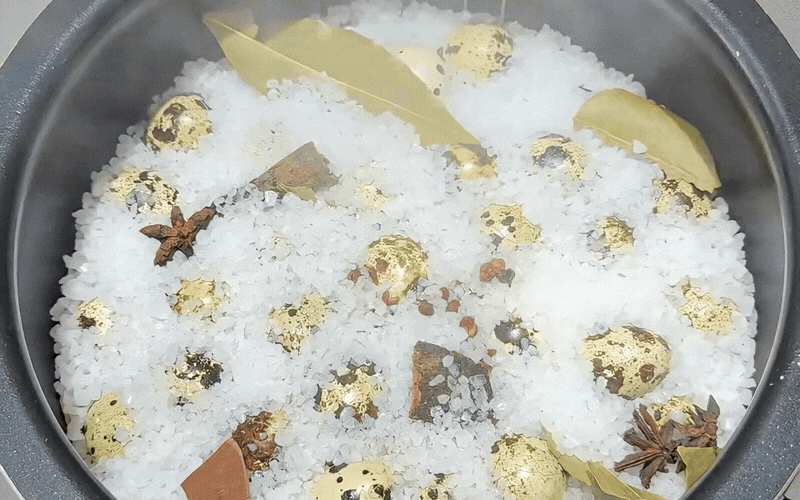 Đầu tiên, bạn rải một lớp muối hột dày khoảng 1-2cm xuống đáy nồi (trên lớp giấy đã lót). Tiếp theo, xếp một lớp trứng cút lên trên. Rắc thêm hoa hồi, quế bẻ nhỏ, lá nguyệt quế và hoa tiêu lên mặt trứng.