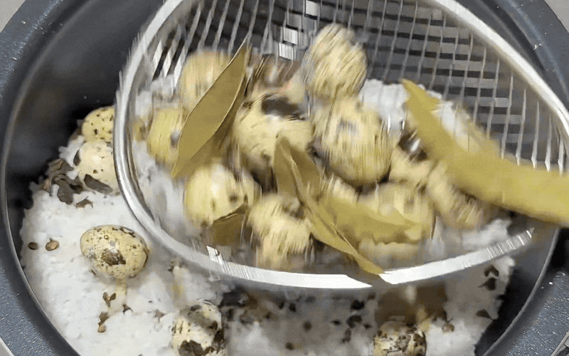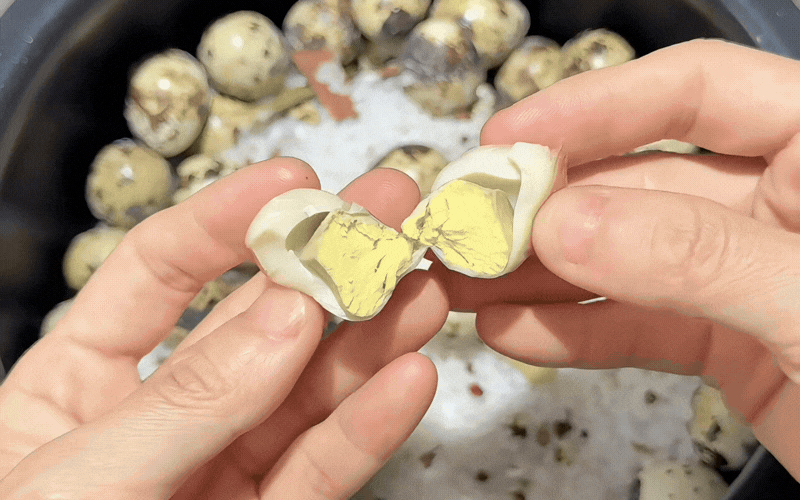 Khi mở nắp nồi, bạn sẽ bị chinh phục ngay lập tức bởi mùi thơm nức mũi lan tỏa khắp gian bếp. Từng quả trứng cút nướng muối khi bóc ra có lớp vỏ dễ bong, lòng trắng màu hổ phách đẹp mắt.