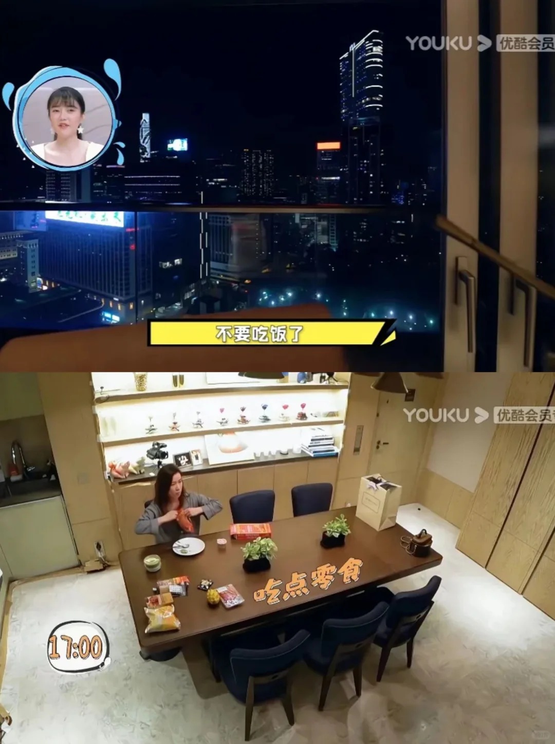Khu vực bếp mở nối liền với phòng ăn là nơi "giữ lửa" của ngôi nhà. Bàn ăn rộng đủ cho 8 người ngồi, phía sau là hệ tủ kệ âm tường tinh tế. Tuy sống một mình nhưng Xa Thi Mạn không hề cô đơn. Cô là người cực kỳ hiếu khách và đam mê nấu nướng. Khác hẳn với những ngôi sao sợ ám mùi dầu mỡ, Xa Thi Mạn thường xuyên đích thân vào bếp, trổ tài làm những món ngon thết đãi hội chị em thân thiết. Nhìn cách cô tỉ mỉ nêm nếm, bày biện món ăn, hay cách cô tận hưởng việc ăn uống (một ngày ăn 5-6 bữa mà vẫn giữ được vóc dáng thon gọn thần sầu), người hâm mộ càng thêm yêu mến sự chân thật, gần gũi của cô.