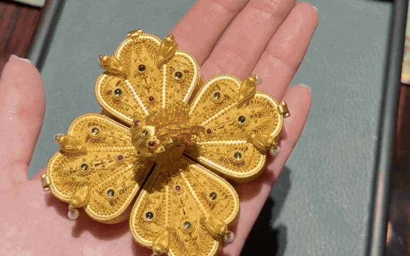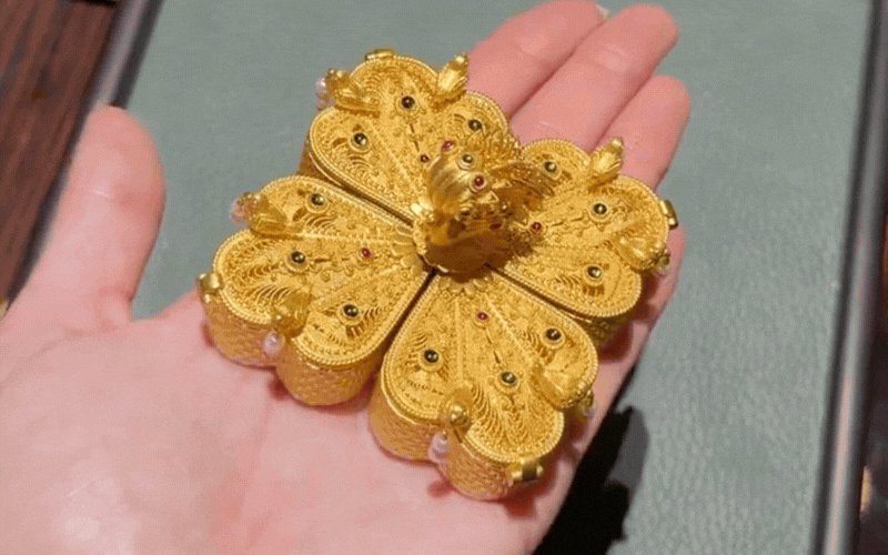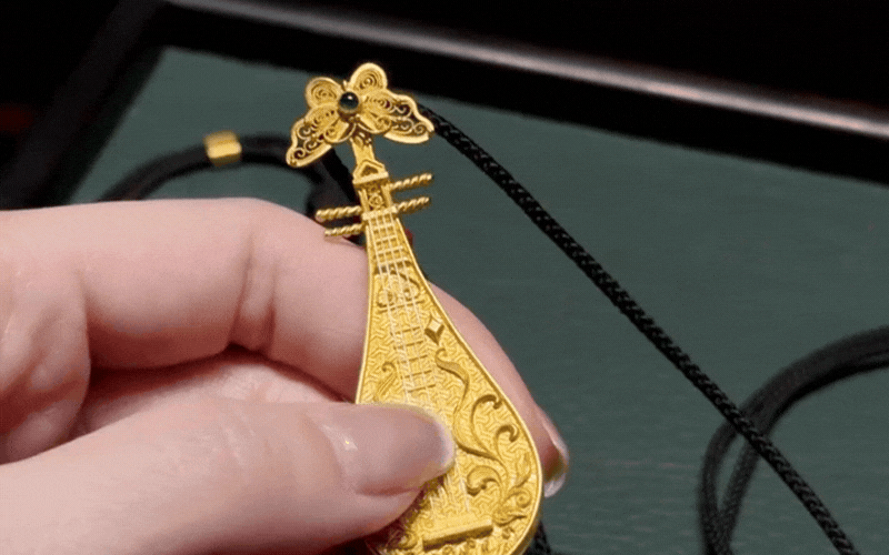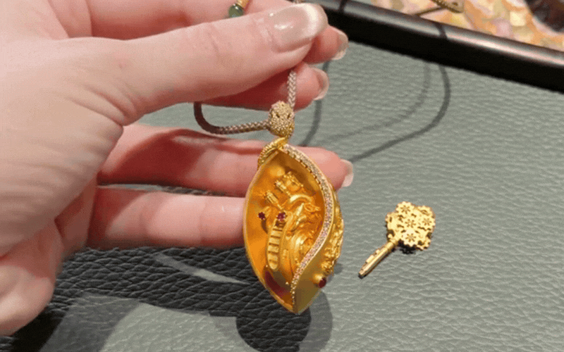 Hay như chiếc hộp trang sức cổ điển tinh xảo chia làm bốn ngăn, mỗi ngăn kéo mở ra là một tác phẩm nghệ thuật đan bằng ren vàng họa hình thiên thần nhỏ mang đậm phong cách truyền thống. Đặc biệt nhất phải kể đến những món đồ chơi thu nhỏ bằng vàng ròng như mặt dây chuyền hình chiếc tỳ bà mini mộc mạc mà các dây đàn thực sự gảy được từng nốt tí hon, hay món đồ trang sức "như ý" với những dải tua rua gắn trên thân ngựa chuyển động nhịp nhàng, rung động theo từng bước đi.