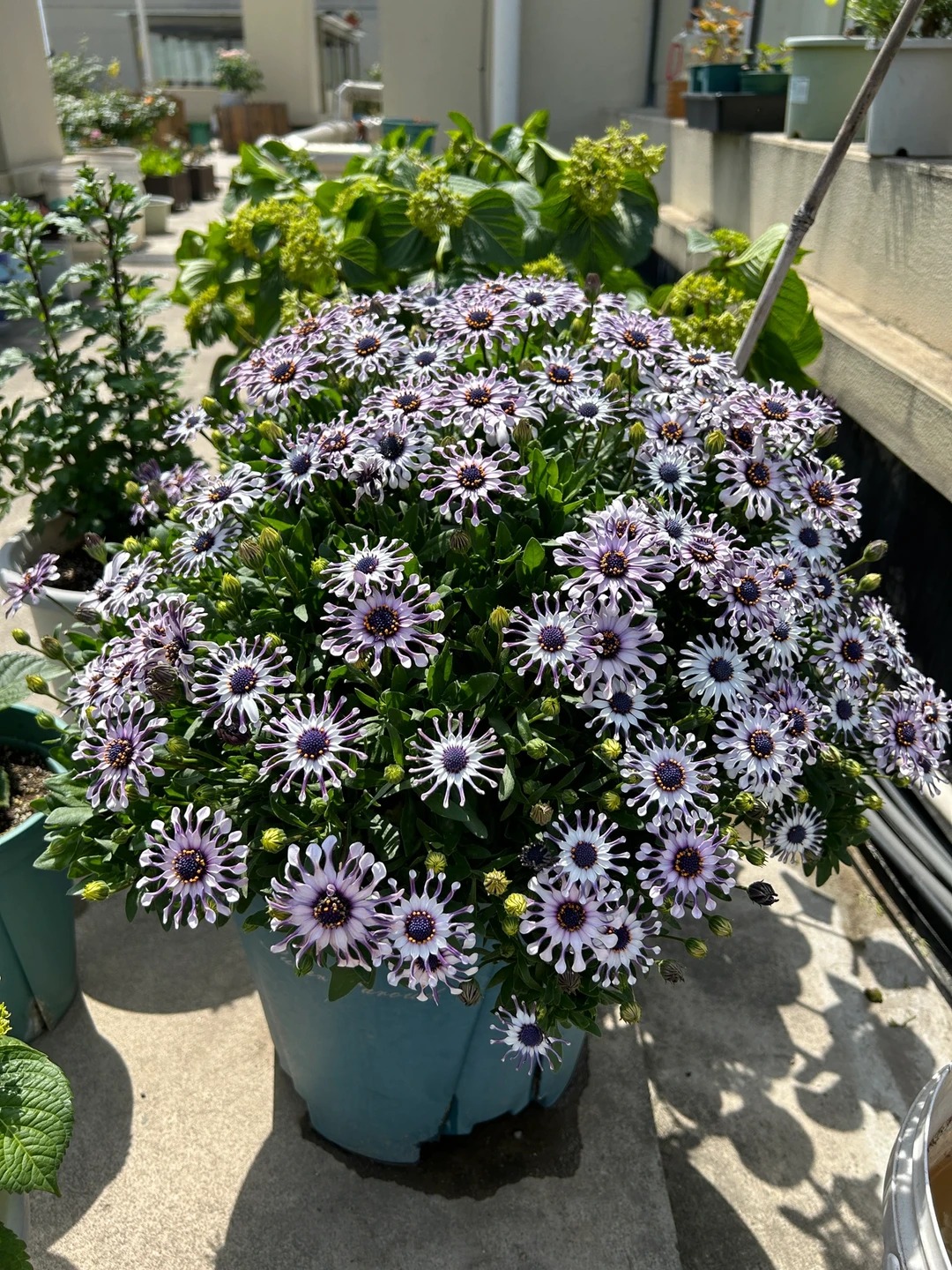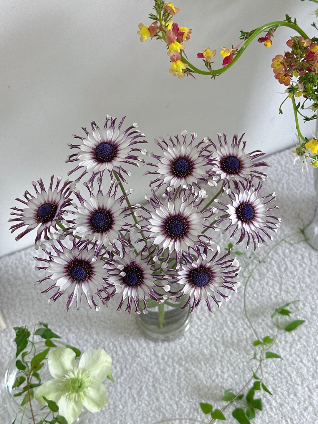 Nổi bật nhất phải kể đến phần nhụy hoa to tròn màu xanh tím thẫm nằm chễm chệ ở trung tâm, sâu thẳm và bí ẩn như một con mắt đang nhìn chằm chằm vào vạn vật. Chính vì cấu trúc "nhụy to đùng, cánh tua tủa cuộn tròn" này mà thời gian gần đây, trên các diễn đàn yêu hoa, nhiều người đã thật thà thú nhận rằng họ không dám mua loài cúc này về chưng Tết.
