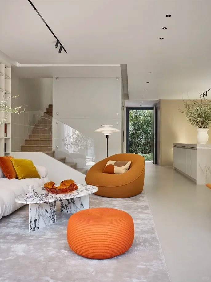 Nhìn qua ảnh, có thể thấy một đảo bếp và bàn trà bằng đá cẩm thạch chạy dài, liền mạch với bề mặt tường; thiết kế này vừa tạo điểm nhấn sang trọng vừa gọn mắt, không lo bừa bộn chi tiết. Bộ sofa, bàn ghế đều form dáng đơn giản, không chạm trổ, nhưng tỷ lệ, chiều cao, độ sâu ghế đều được tính kỹ để ngồi xuống là thấy “êm người”. Điều này nghe có vẻ nhỏ, nhưng với những ai ở tuổi 50–70, chuyện ngồi sao cho không đau lưng, nằm sao cho dễ thở là cả một bài toán.