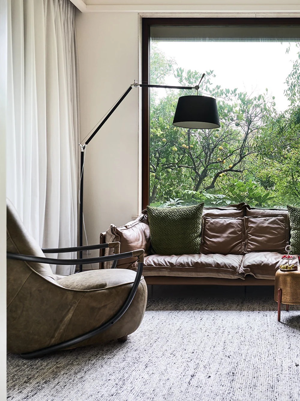 Căn nhà của Vương Thạch và Điền Phác Quân là dạng biệt thự biển liền kề, nằm ở vịnh Đại Bằng, Thâm Quyến. Vị trí sát biển, phía trước là mặt nước mênh mông, xung quanh là thảm cây tự nhiên, không bị bê tông hóa quá mức nên nhìn vào đã thấy dễ chịu. Tinh thần chủ đạo của căn nhà là “sống cùng thiên nhiên” chứ không phải “đè” thiên nhiên xuống để khoe đẳng cấp.