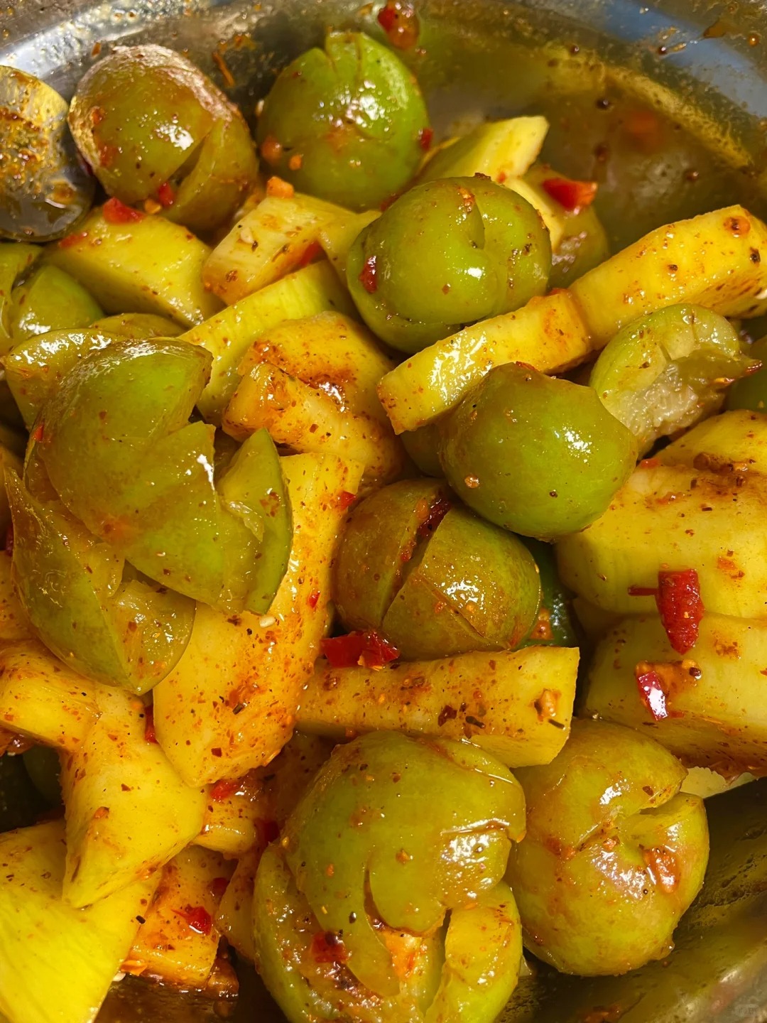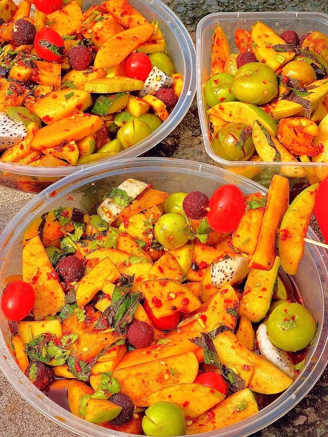 Người ta dùng đủ loại quả mọng theo mùa như ổi, củ đậu, củ cải, mận xanh... đem ngâm vào thứ nước chua ngọt bí truyền. Miếng trái cây cắn vào cứ giòn tan, nước tươm ra chua chua ngọt ngọt, rắc thêm chút bột ớt cay xè đỏ au. Vừa ăn vừa hít hà, cái vị chua cay ấy xua tan ngay đi cái nóng hầm hập, bảo sao đây lại là "thần dược" mở đường tiêu hóa số một của người dân nơi đây.