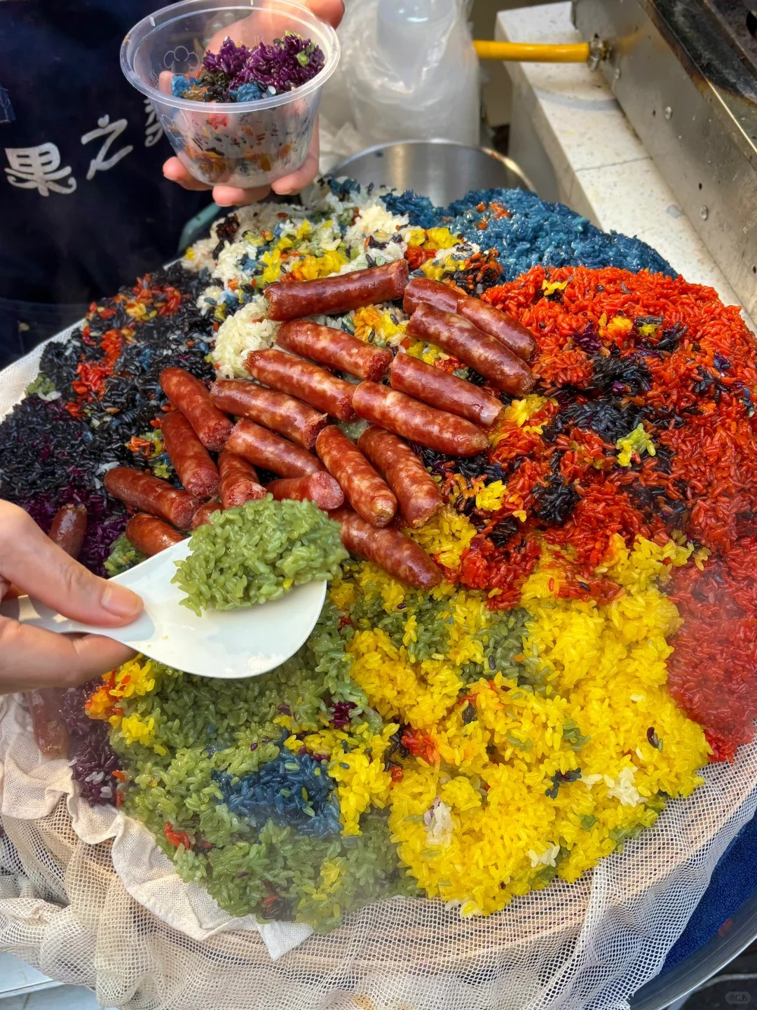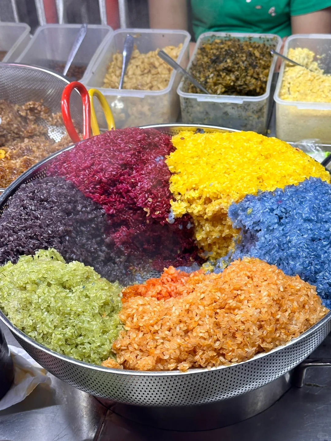Lang thang đến xế chiều, khi bụng đã ngót, bạn sẽ dễ dàng bắt gặp những thúng xôi ngũ sắc rực rỡ bốc khói nghi ngút. Chẳng cần phải giải thích nhiều, món xôi này giống hệt món xôi ngũ sắc trứ danh của đồng bào Tây Bắc nước ta. Vẫn là những hạt gạo nếp nương nẩy nở, được nhuộm màu hoàn toàn từ lá cây rừng: Màu đen từ lá phong, màu đỏ và tím từ lá cẩm, màu vàng từ quả dành dành.