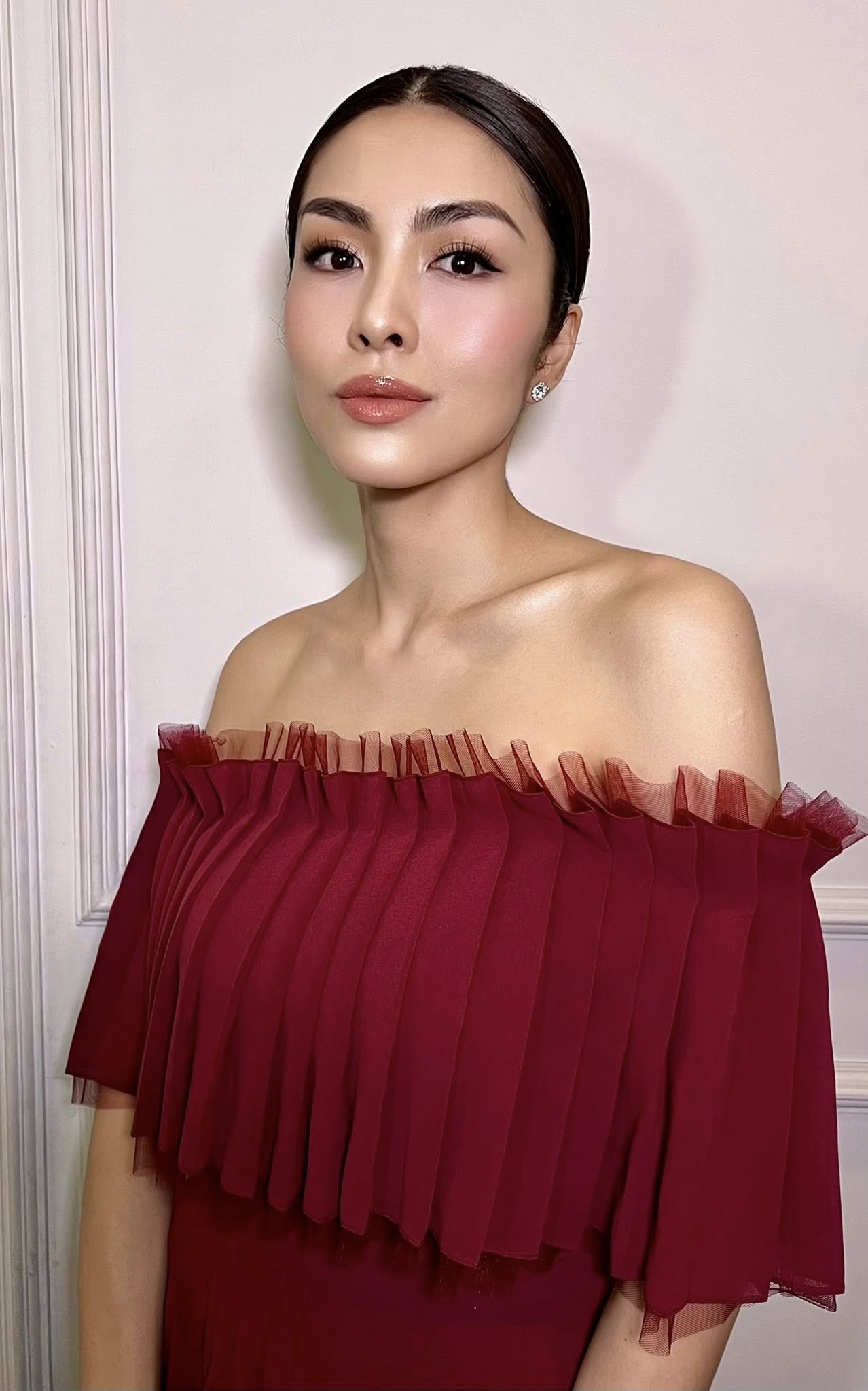 Kể từ khi rút khỏi làng giải trí, "ngọc nữ màn ảnh" hiếm khi dự sự kiện, vì thế mỗi lần lộ diện đều khiến truyền thông "dậy sóng". Trong buổi tiệc tối, Hà Tăng diện đầm trễ vai đỏ xếp tầng, khoe sống lưng mảnh mai và bờ vai gầy tựa "móc áo" - vẻ đẹp mong manh nhưng đầy kiêu hãnh khiến nhiều chị em phải thốt lên ngưỡng mộ.