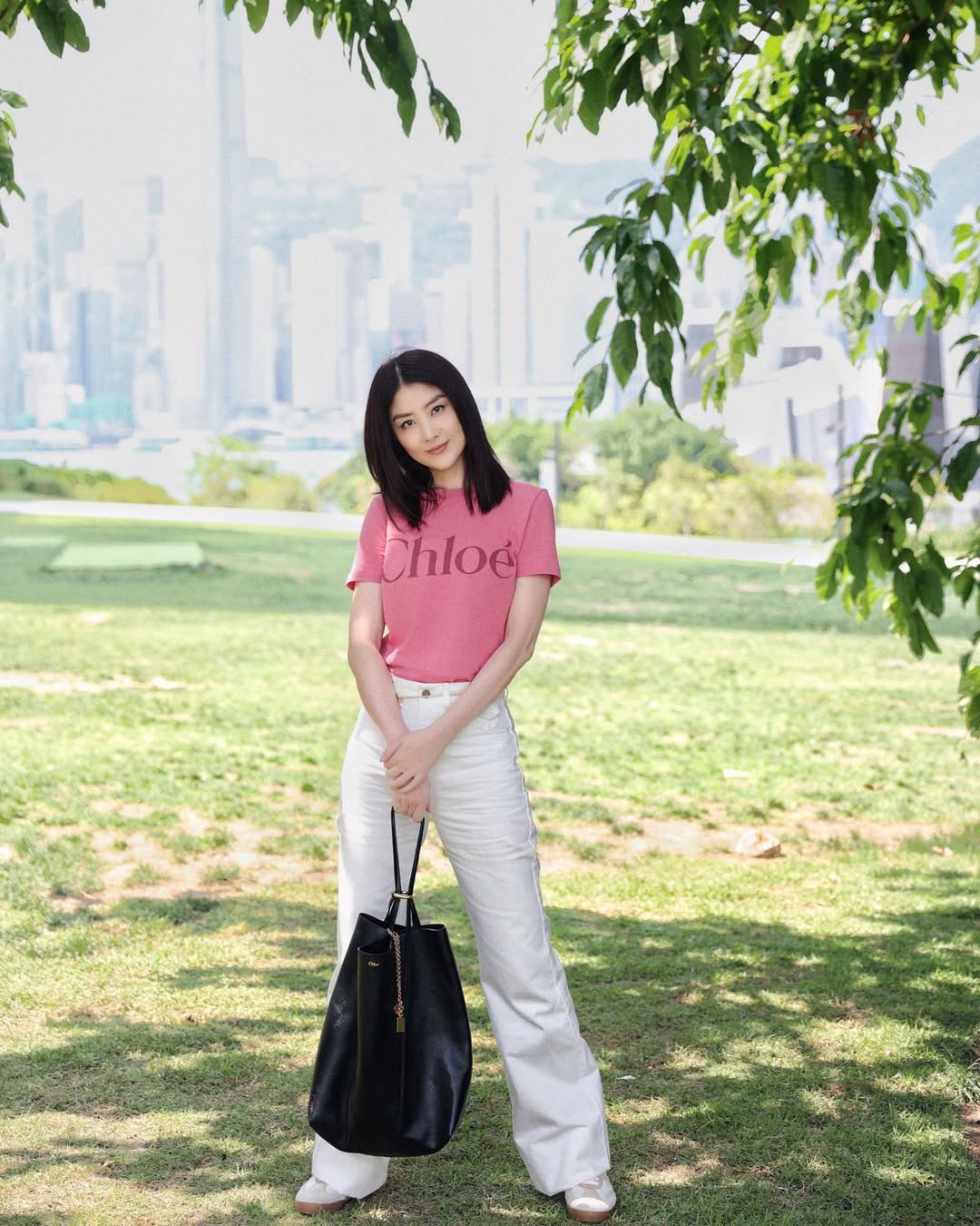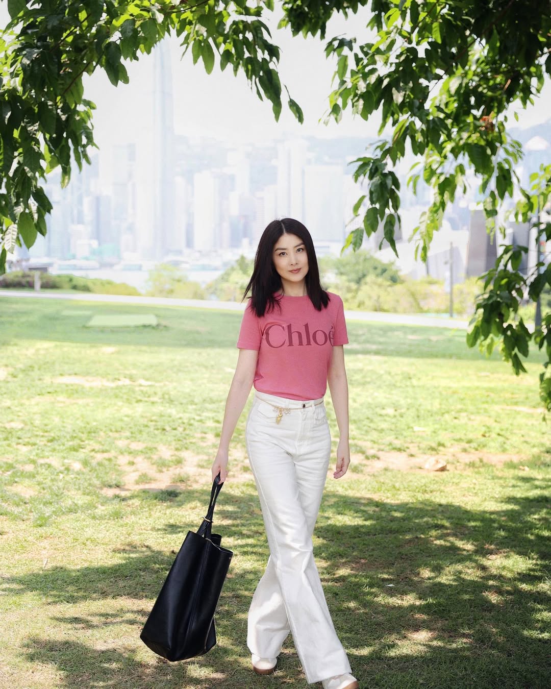 Vừa qua, loạt ảnh dạo phố của nữ ca sĩ, diễn viên Hong Kong Trần Tuệ Lâm đã bất ngờ phủ sóng mạng xã hội. Không thảm đỏ rình rang, cô chỉ xuất hiện tại một công viên bình thường, diện chiếc áo thun ngắn tay màu hồng phối cùng quần jeans trắng ống rộng cạp cao.