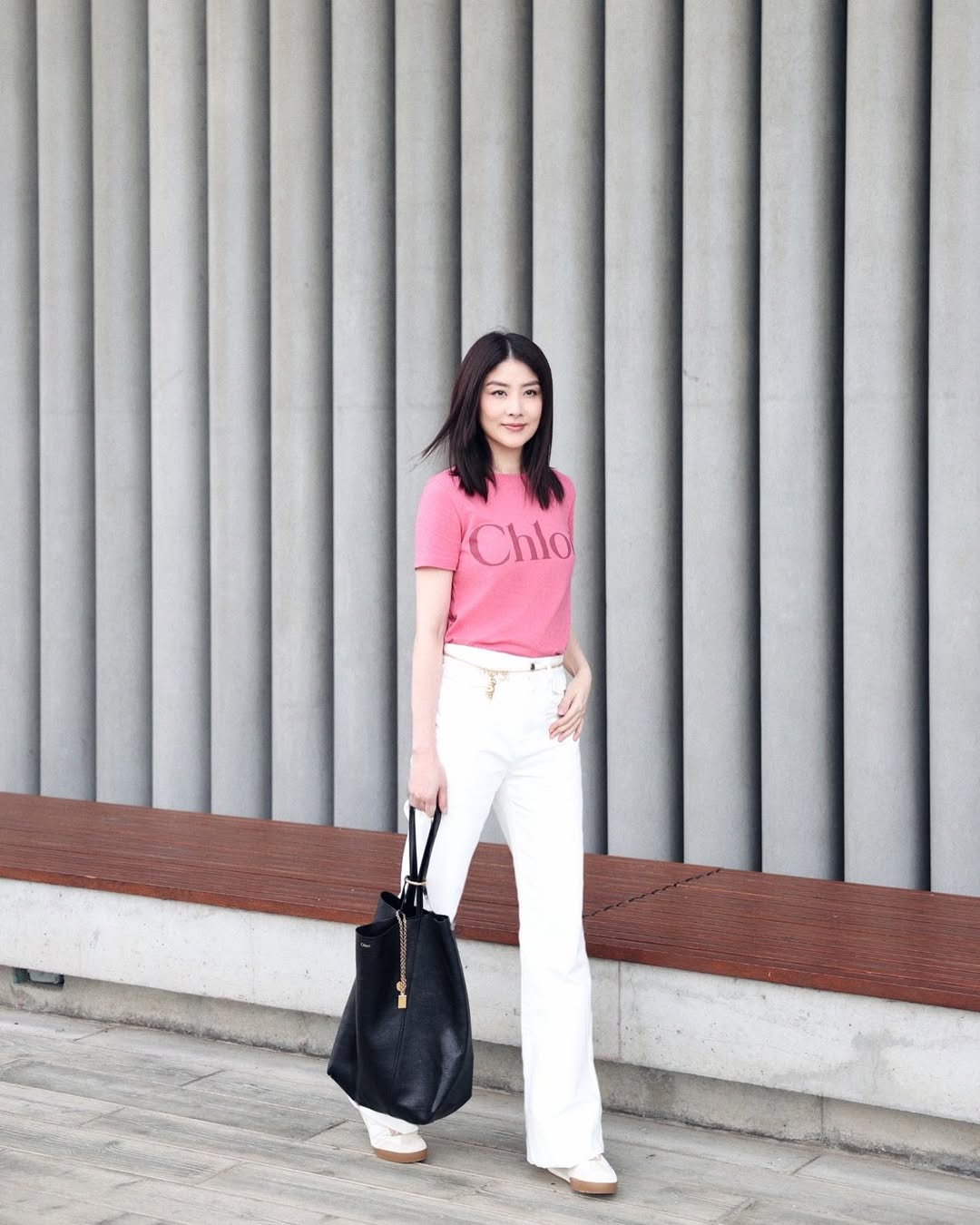 Bóc tách phong cách của nữ diễn viên, có thể thấy sự tinh tế đầu tiên nằm ở việc lựa chọn màu sắc đầy thông minh. Chiếc áo thun cô diện không mang sắc hồng neon chói lọi, mà là tông hồng pastel (hồng macaron) có độ bão hòa thấp. Khi được đặt cạnh sắc trắng tinh khôi, bộ đôi này tạo nên hiệu ứng hắt sáng tự nhiên, tựa như một tấm hắt sáng giúp làn da trông rạng rỡ, nhuận sắc hơn mà không hề bị "sến" hay làm xỉn màu da.