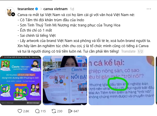 Người dùng @emmanguyen13, một chuyên gia EdTech với hơn một thập kỷ trong ngành, chỉ ra rằng đội ngũ Canva Vietnam đang "thất bại với ngôn ngữ và văn hóa Việt Nam theo những cách ngây thơ nhất có thể."