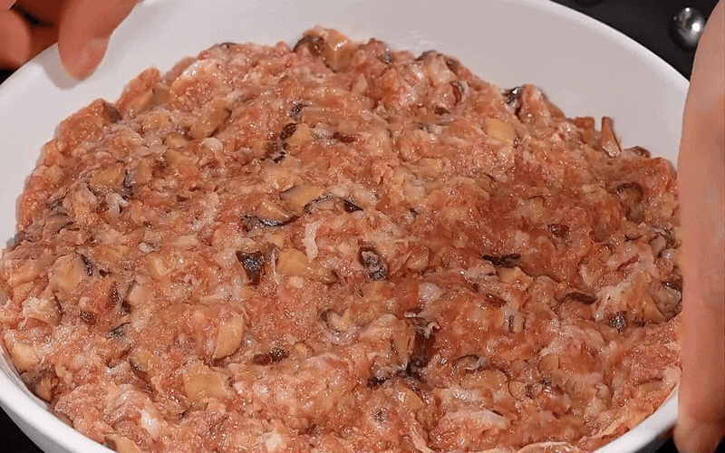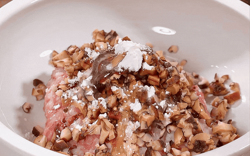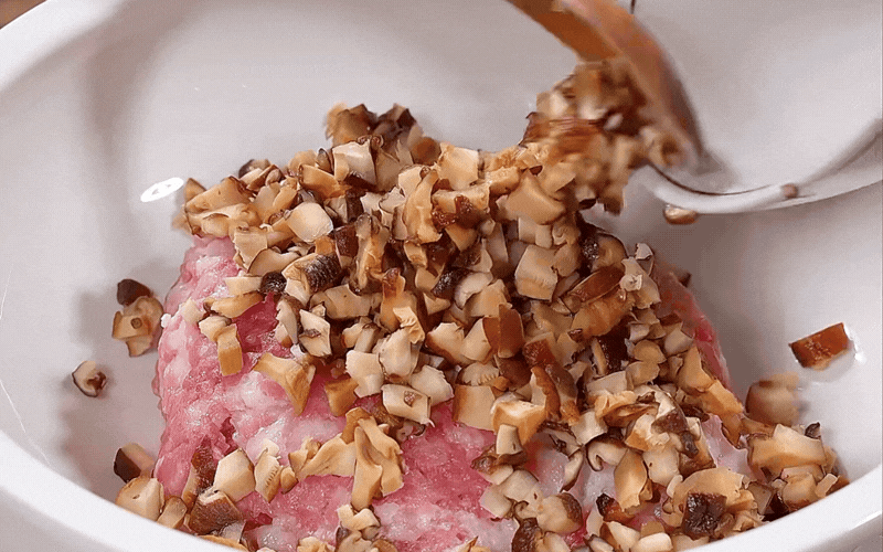Cho phần thịt băm và nấm đông cô thái hạt lựu vào một chiếc bát lớn.