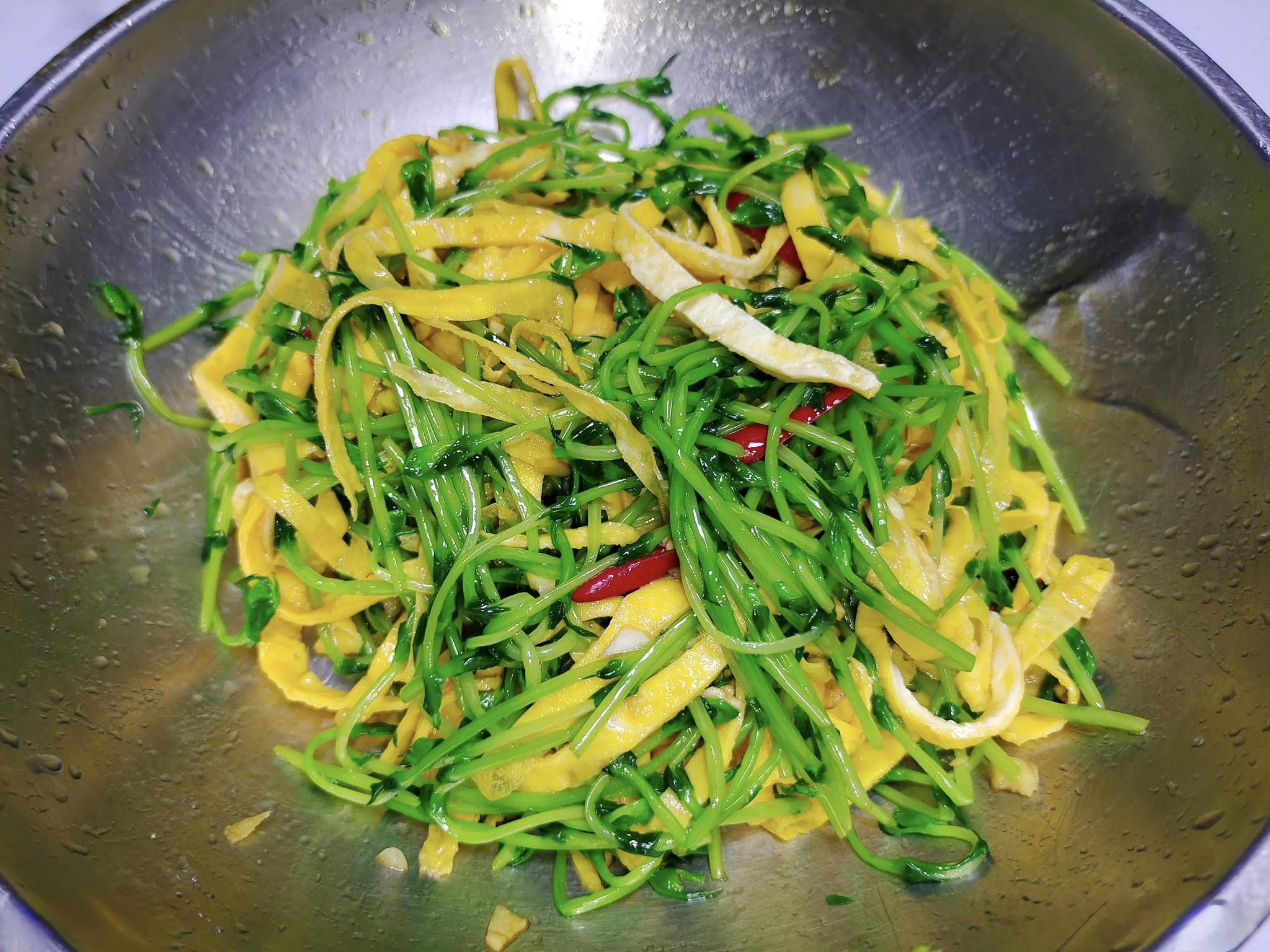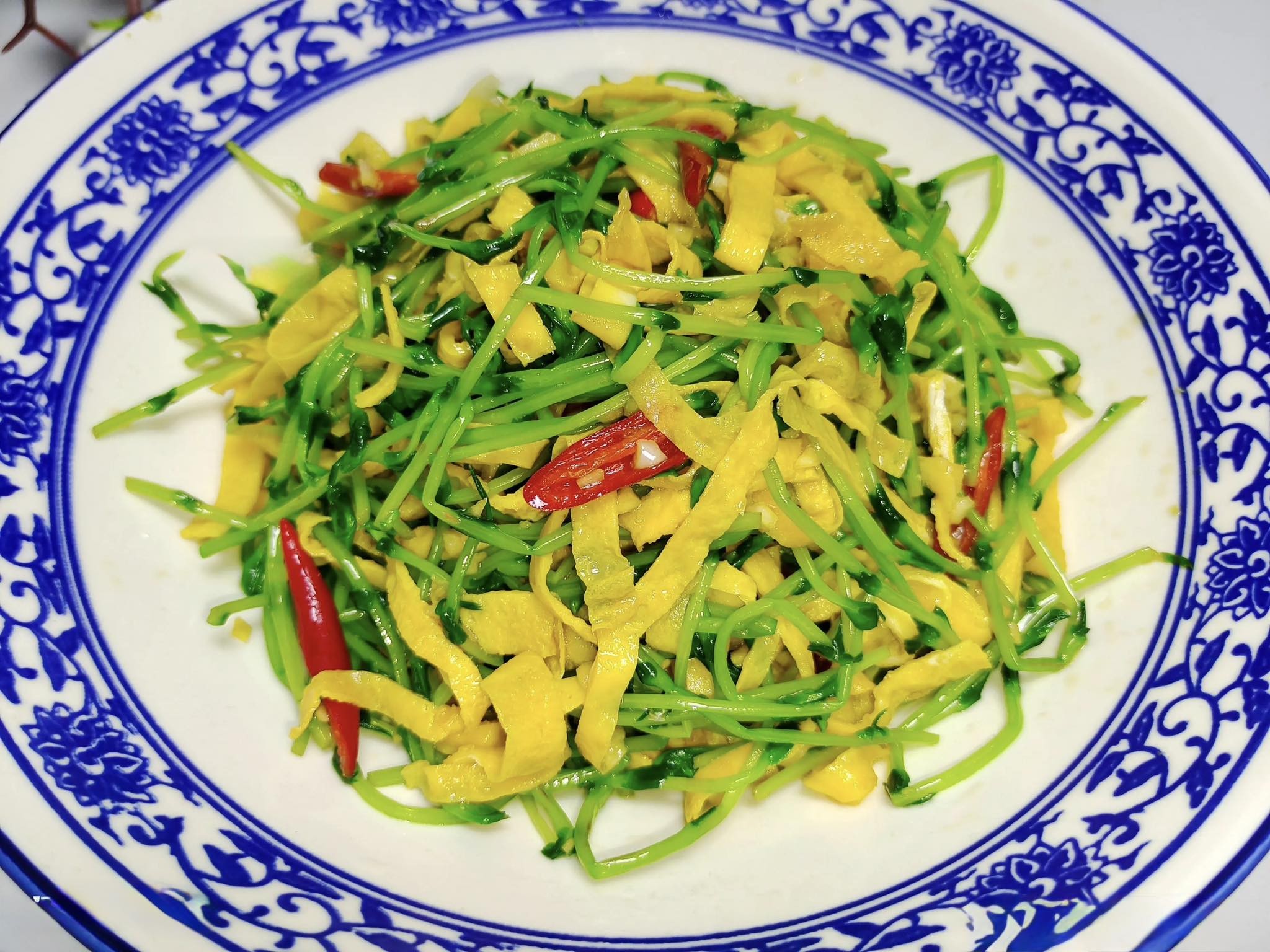 Đây là một món ăn rất thanh mát, đặc biệt là độ giòn và mềm của rau mầm đậu Hà Lan, kết hợp với vị tươi mát hơi ngậy bùi của trứng thái sợi, tạo nên sự cân bằng hoàn hảo giữa hương vị và kết cấu. Sau khi ăn quá nhiều đồ ăn nhiều dầu mỡ, món ăn này là một cách tuyệt vời để làm sạch vị giác, loại bỏ dầu thừa và kích thích sự thèm ăn. Rau mầm đậu Hà Lan khá non, vì vậy không nên chần quá lâu. Thêm một ít nước tinh bột vào hỗn hợp trứng có thể làm cho trứng có đàn hồi hơn, nhờ đó sẽ không dễ bị vỡ hoặc vụn khi cắt thành từng dải.