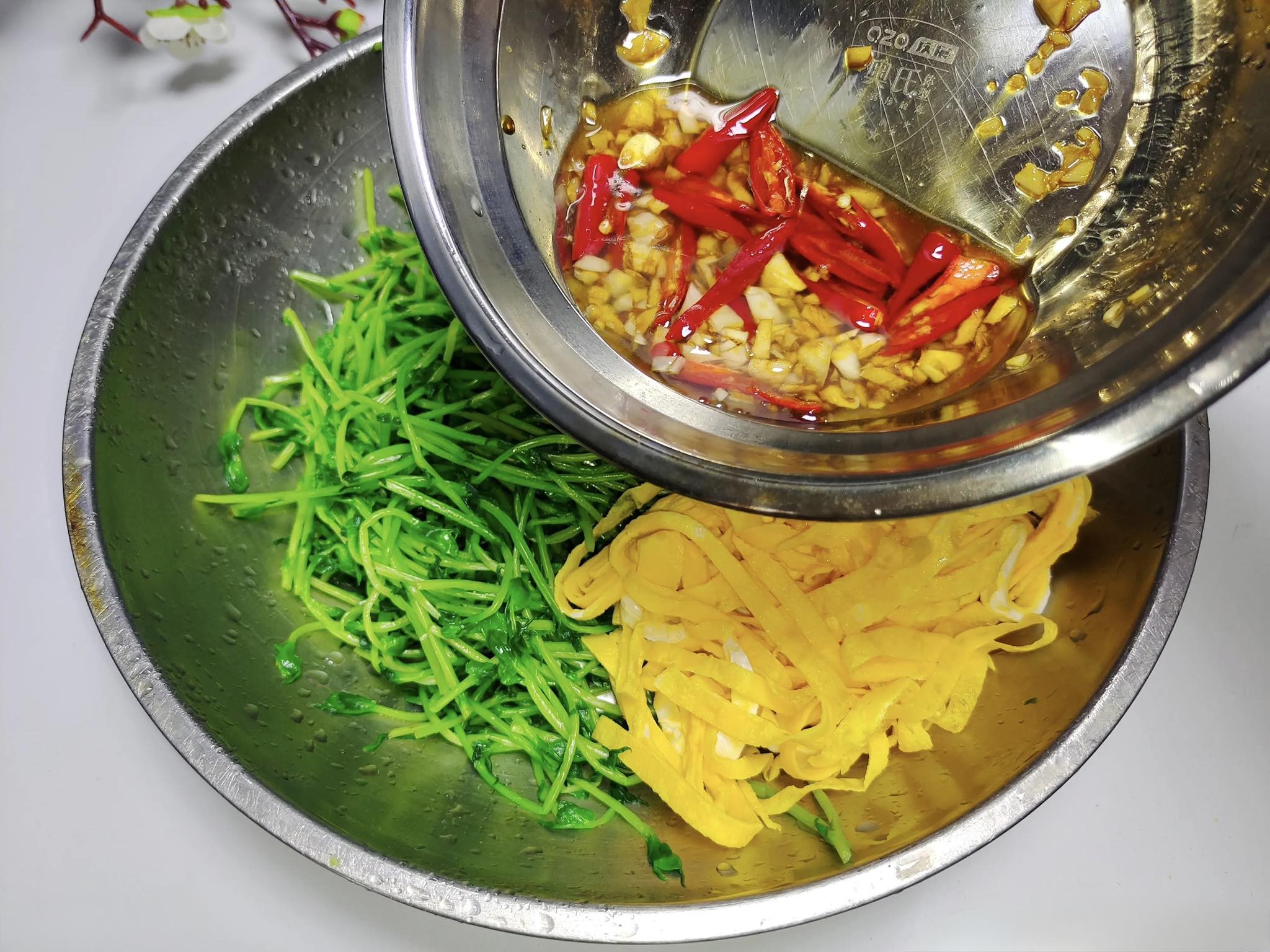 Bước 3: Tiếp theo chúng ta sẽ chuẩn bị nước sốt. Cho tỏi băm nhỏ vào bát, sau đó cho thêm ớt, nước tương, một chút muối, một chút tinh chất cốt gà, giấm gạo trắng và 1 muỗng canh dầu mè. Trộn đều. Nếu bạn không thích ăn cay, bạn có thể thay thế ớt đỏ bằng ớt chuông đỏ lớn hoặc cà rốt bào sợi. Vớt rau mầm đậu Hà Lan đã nguội, vắt bớt nước thừa rồi cho vào tô, rũ cho tơi ra. Thêm trứng thái sợi, sau đó đổ nước sốt đã chuẩn bị ở bước trước vào. Trộn đều bằng tay cho đến khi các nguyên liệu quyện vào nhau, rồi bày ra đĩa và thưởng thức.