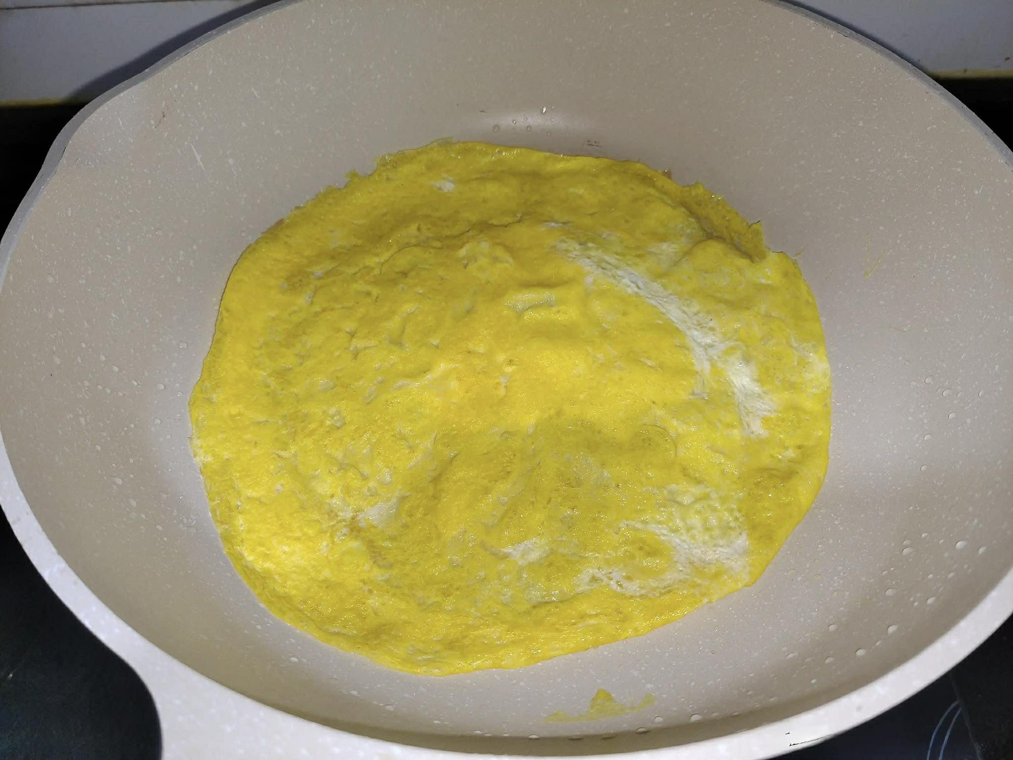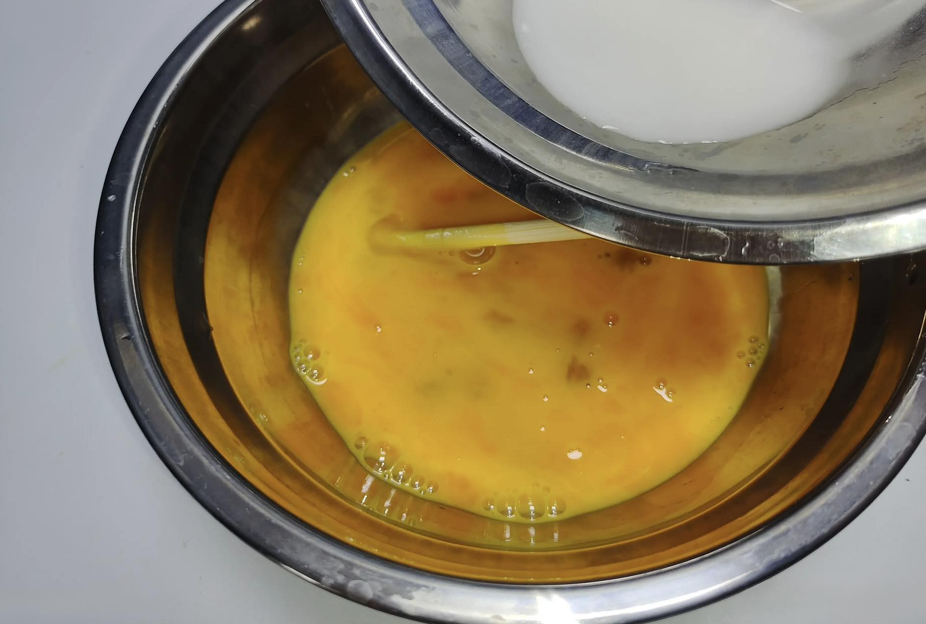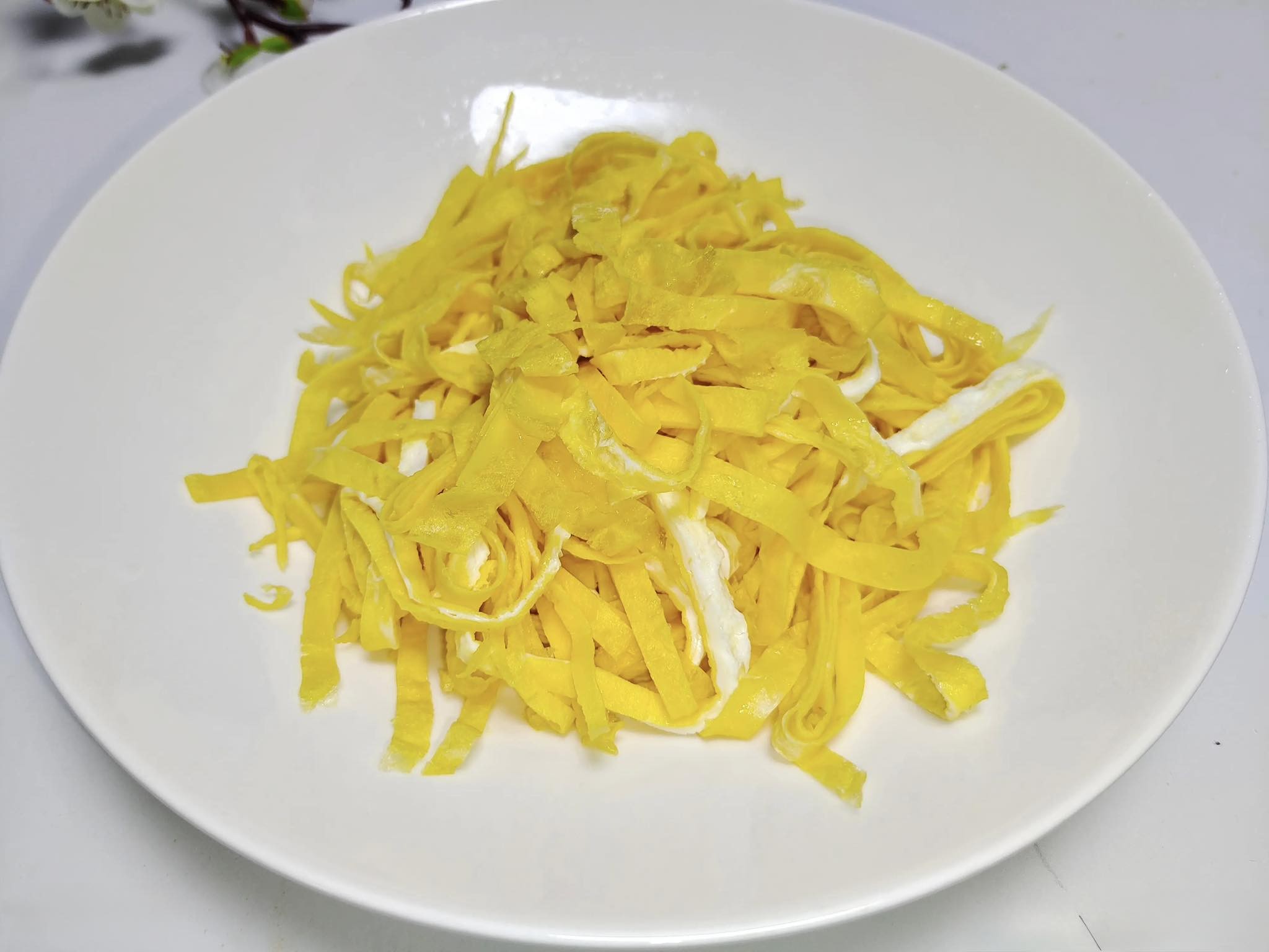 Bước 2: Đập trứng vào trong bát và đánh đều. Sau đó, bạn pha bột bắp với chút nước để tạo thành hỗn hợp sánh sệt rồi đổ vào trứng, sau đó khuấy đều. Lưu ý rằng bạn không nên đổ bột bắp khô trực tiếp vào hỗn hợp trứng, vì điều này sẽ ngăn cản tinh bột tan và gây ra vón cục. Làm nóng chảo chống dính, đổ hỗn hợp trứng vào, nhấc chảo lên và xoay nhẹ để dàn đều hỗn hợp trứng thành bánh crepe trứng. Chiên khoảng mười giây, sau đó lật mặt và chiên thêm khoảng mười giây nữa. 3 quả trứng này sẽ làm được 3 bánh crepe trứng. Khi tất cả các bánh crepe trứng đã chín, cuộn chúng lại và cắt thành từng dải.