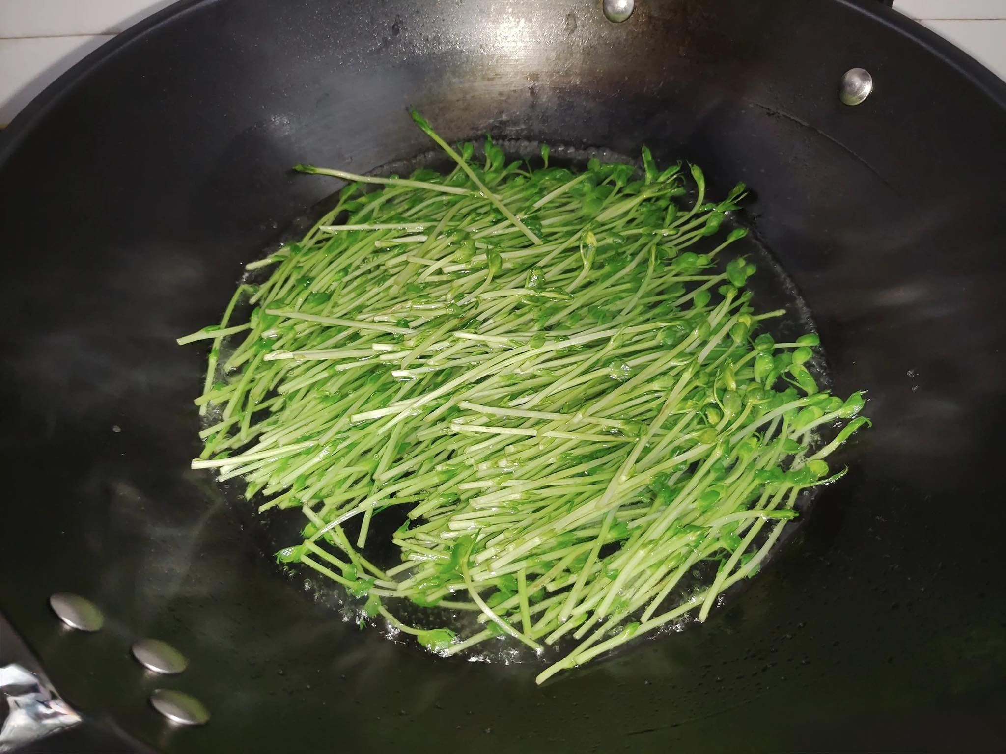 400g rau mầm đậu Hà Lan, 3 quả trứng gà, vài quả ớt đỏ (tuỳ thích), 3-5 tép tỏi, 1 muỗng canh nước tương, muối, tinh chất cốt gà, lượng giấm gạo trắng vừa đủ, một lượng dầu mè vừa đủ, một lượng dầu ăn vừa đủ, 1 muỗng canh bột bắp pha loãng.