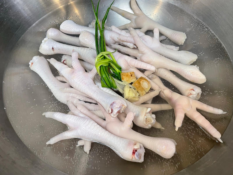 Bước 1: Rửa sạch chân gà, cắt bỏ móng, cho vào bát, thêm rượu gạo và nước tương đen, trộn đều và ướp trong nửa tiếng. Sau đó đặt chân gà vào nồi chiên không dầu, cài đặt nhiệt độ 190 độ C và chiên trong 30 phút. Hoặc bạn có thể chiên trong chảo dầu nóng. Sau đó, ngay lập tức cho chân gà vừa chiên xong vào nước lạnh để ngâm.