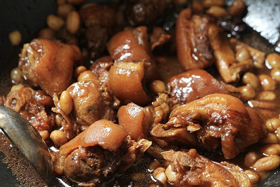 Nguyên liệu: 1-2 cái đuôi heo, nửa bát đậu phộng, 3 muỗng canh nước tương, 3 muỗng canh dầu hào, 1 muỗng canh nước tương đen, 2 muỗng canh rượu gạo, lượng bột tiêu vừa phải, muối vừa ăn, 1 muỗng canh tương đậu nành, 4 lát gừng.