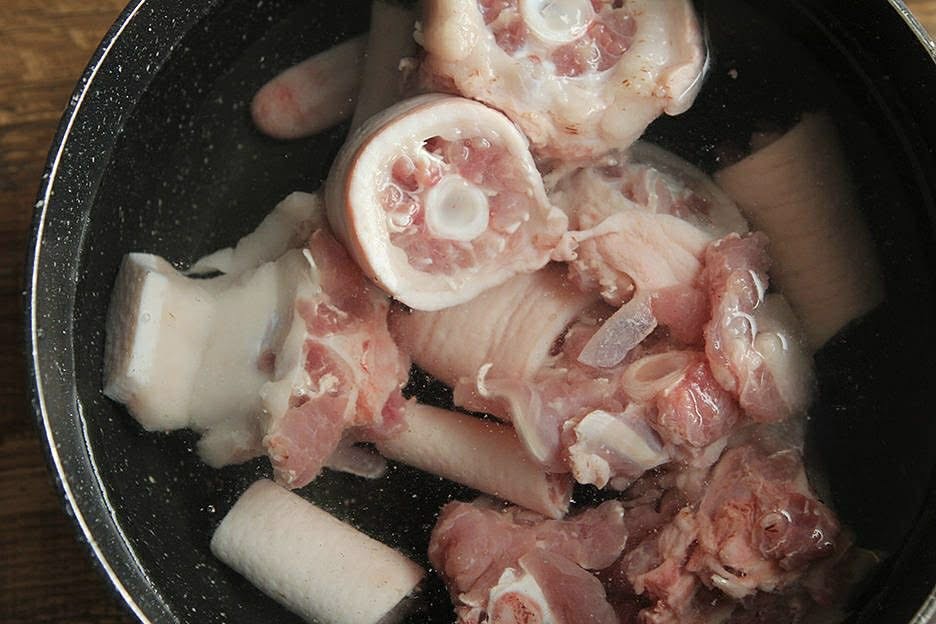 Bước 1: Ngâm đậu phộng trước 2 tiếng cho đến khi nở mềm. Rửa sạch đuôi heo sao khi bóp muối, cắt thành từng miếng nhỏ, chần qua nước sôi rồi vớt ra.