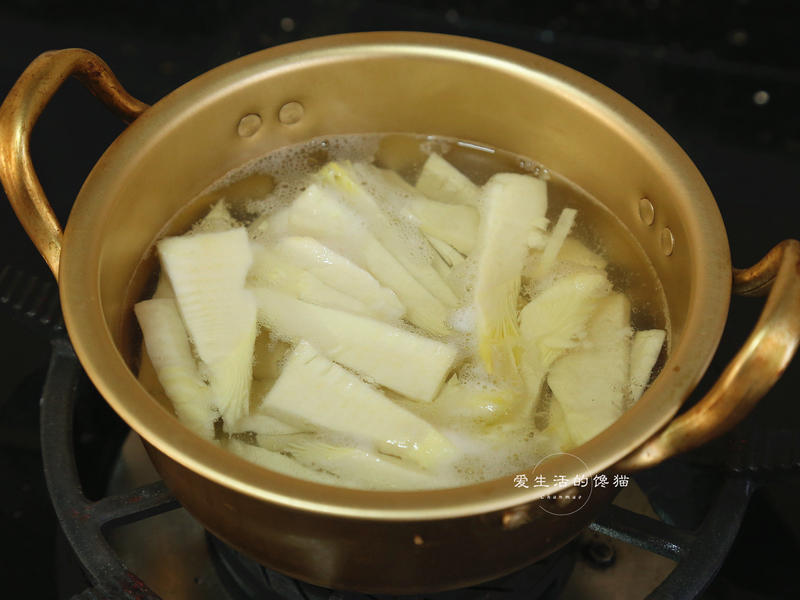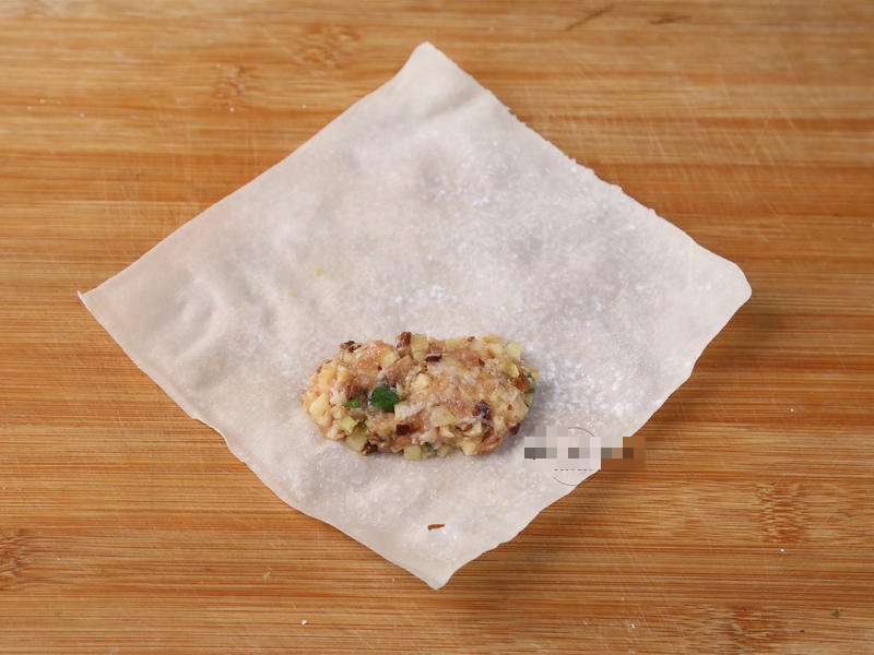 Bước 1: Bóc vỏ măng và thái lát. Đun sôi một nồi nước, cho một ít muối, cho măng vào luộc trong 3 phút. Vớt ra và rửa sạch với nước lạnh. Băm nhỏ thịt vai heo, ngâm nấm hương khô cho mềm rồi thái nhỏ. Cho thịt heo băm, nấm hương khô, măng thái hạt lựu và các gia vị còn lại vào bát, trộn đều và ướp trong 10 phút.