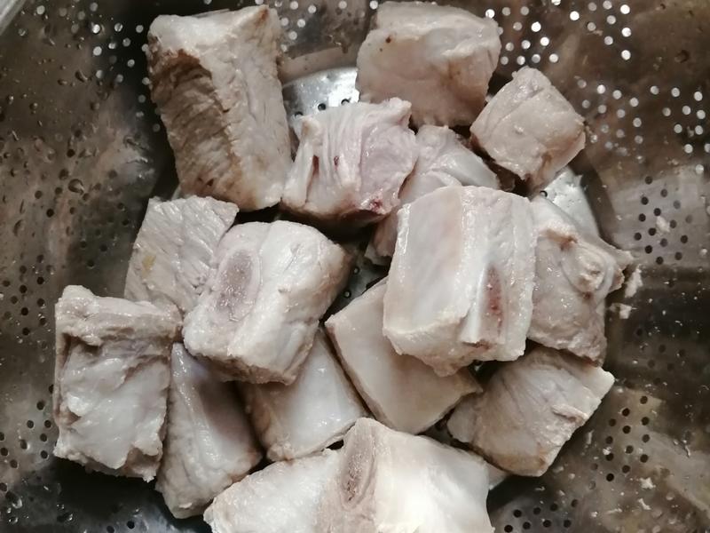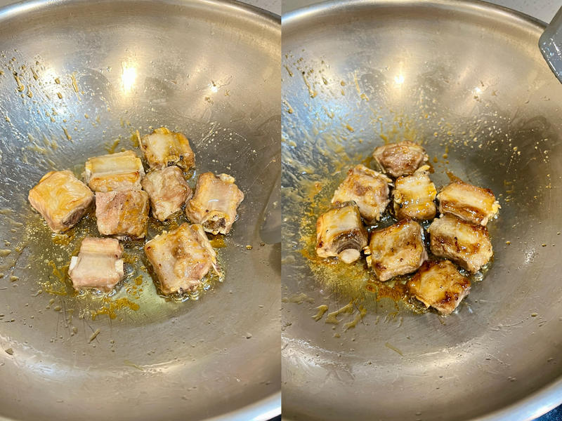 Bước 1: Chặt sườn heo thành từng miếng vừa ăn, cho vào nồi, đổ nước lạnh ngập sườn, đun sôi rồi hạ nhỏ lửa, nấu trong 3 phút trước khi vớt ra. Cho một ít dầu vào nồi, trút sườn vào và chiên trên lửa vừa nhỏ cho đến khi cả hai mặt hơi vàng nâu. Thêm gừng thái lát và rượu gạo vào đảo đều cho đến khi thơm.