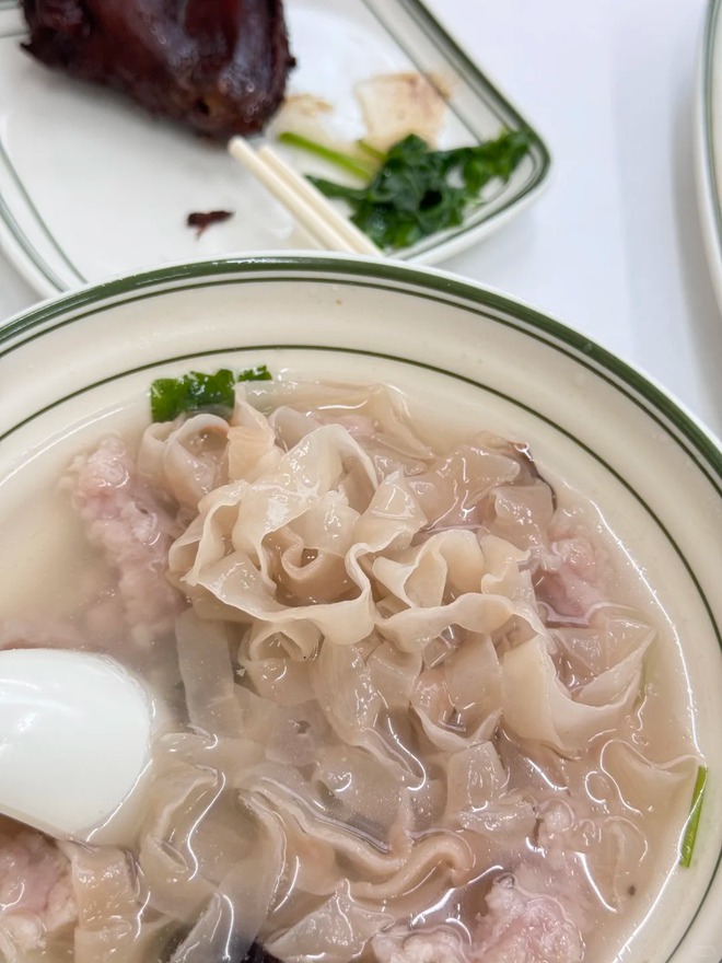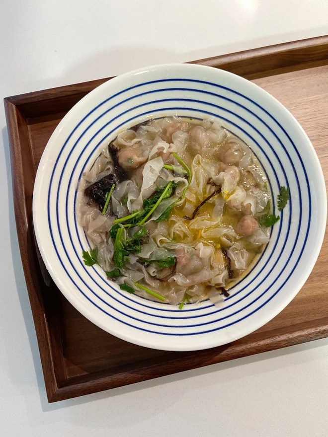 Lớp vỏ (yến bì) trơn tuột, mướt mát lướt qua đầu lưỡi, dai nhưng không cứng, mềm nhưng không nát. Bên trong lớp vỏ "thịt" ấy lại là phần nhân thịt băm nêm nếm đậm đà, quyện với chút mã thầy (củ năng) giòn sần sật. Nước dùng ngọt thanh, thấm đẫm vào từng thớ "mì thịt", tạo nên một tổng thể hài hòa. Ăn một bát mì mà cảm giác như đang nạp vào cơ thể một nguồn năng lượng tinh khiết, giàu đạm nhưng lại nhẹ bụng vô cùng. Đây chẳng phải là món ăn trong mơ của hội chị em đang theo đuổi chế độ ăn ít tinh bột (Low-carb) hay sao?