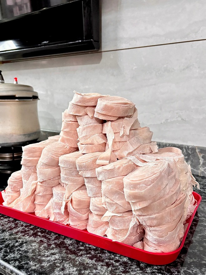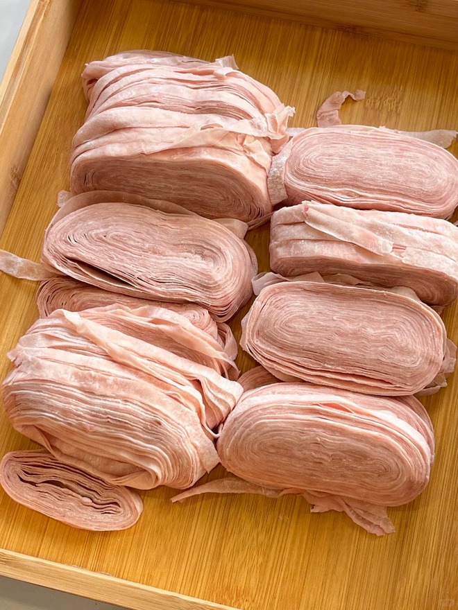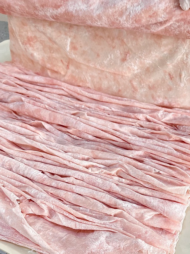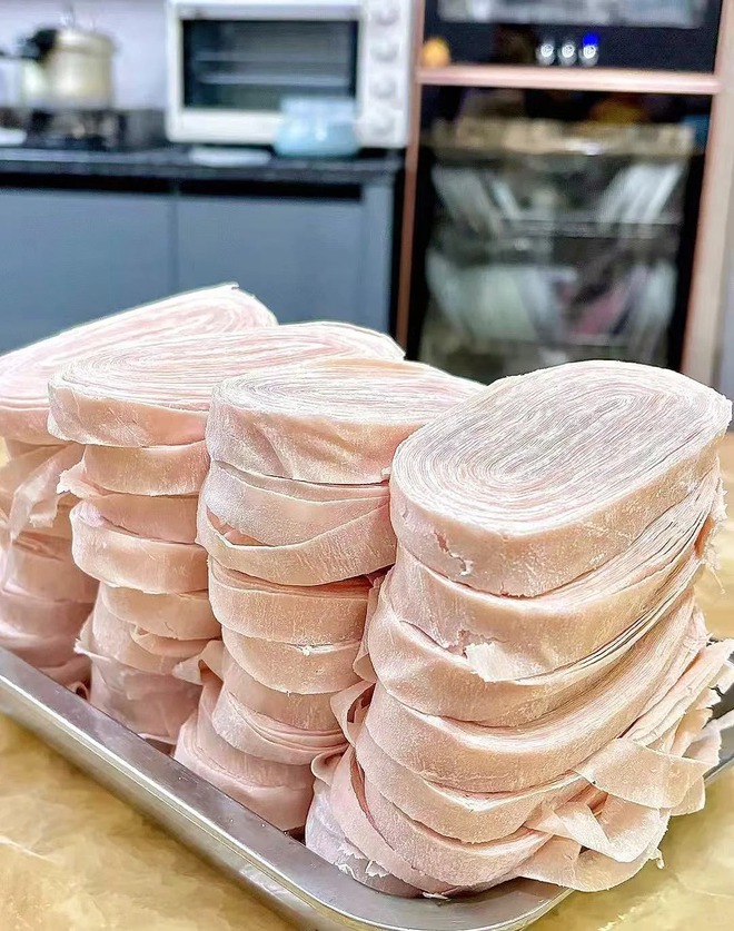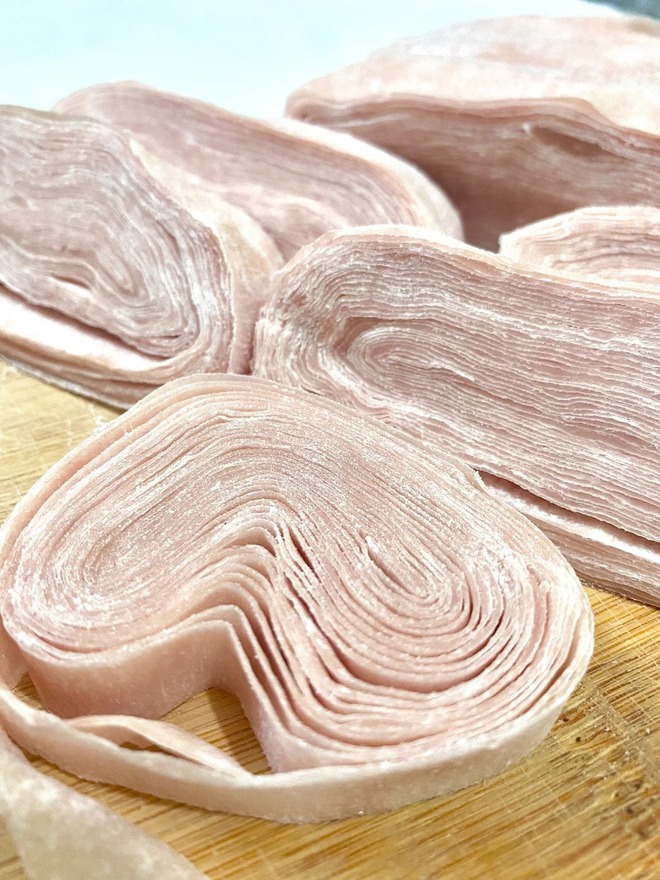 Cán đến độ nào ư? Cán đến độ miếng thịt mỏng như tờ giấy quyến, có thể nhìn xuyên qua được, người ta ví nó "mỏng như cánh ve sầu" (bạc như thiên dực). Tấm "vải thịt" ấy được phơi khô hoặc dùng tươi để cắt thành sợi mì hoặc làm vỏ gói nhân. Thế nên, khi ăn bát mì này, thực chất là bạn đang thưởng thức một khúc biến tấu đầy ngẫu hứng của thịt heo: Vỏ là thịt, nhân là thịt, mì cũng là thịt. Một khái niệm "thịt toàn tập" nhưng lại thanh tao đến lạ lùng.