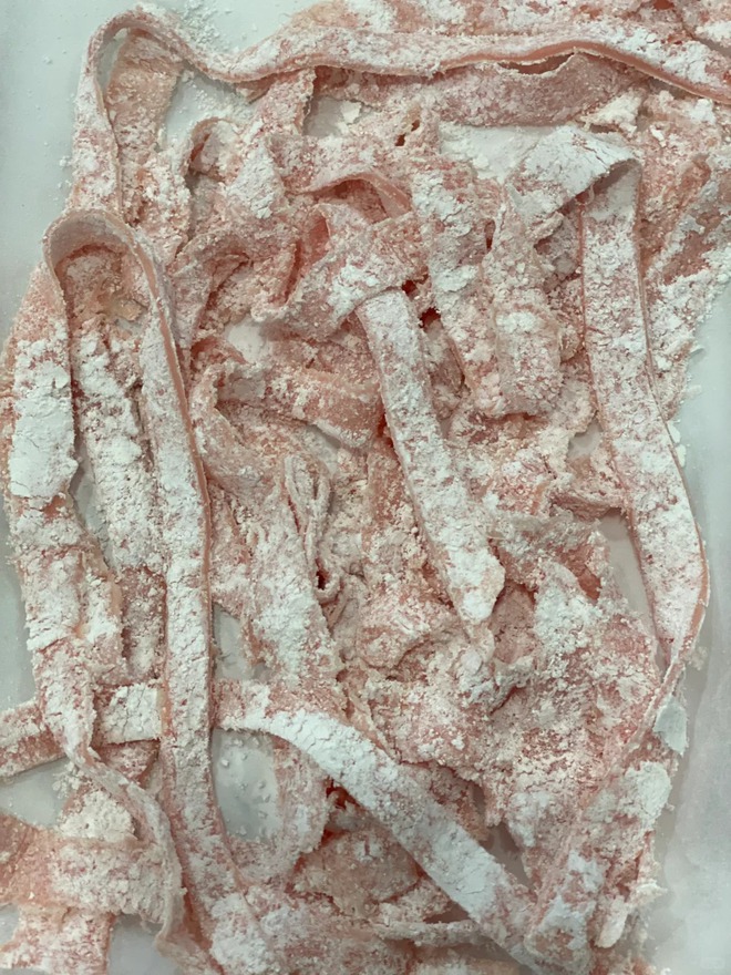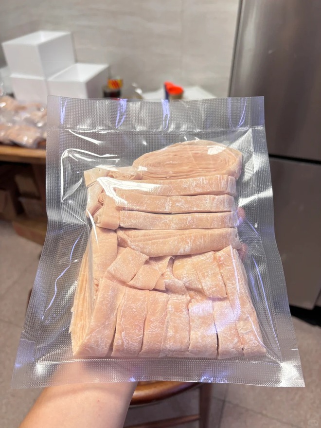 Điều khiến thực khách ngỡ ngàng nhất là nguyên liệu. Không phải bột mì cán mỏng, "yến bì" được làm hoàn toàn từ thịt nạc heo tươi rói, vừa mới mổ xong, vẫn còn ấm nóng. Người thợ phải lọc bỏ hết gân, mỡ, rồi dùng chày gỗ nặng cả ký lô đập liên hồi xuống khối thịt. Không được băm, không được xay, mà phải là "đập". Đập cho đến khi thớ thịt tan nát, nhuyễn nhừ thành một dạng keo dẻo quánh mịn màng. Lúc này, người ta mới rắc vào đó một chút bột khoai lang (hoặc bột củ năng) thượng hạng, nhào nặn rồi cán mỏng.