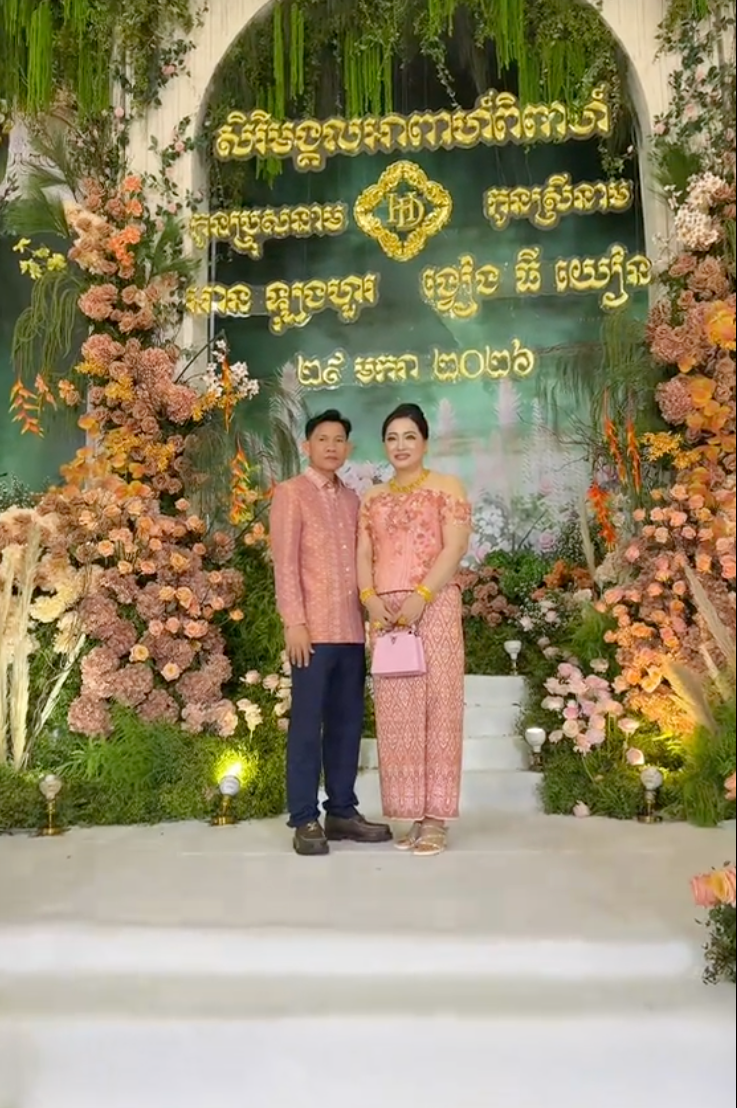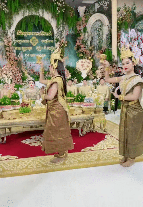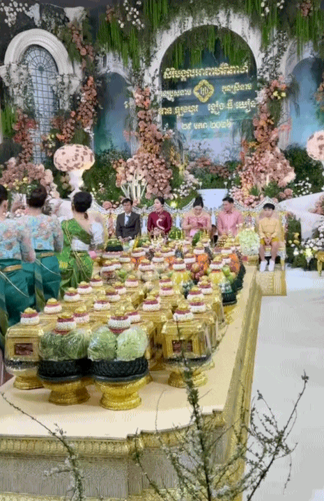 Bên cạnh những khoảnh khắc gia đình đầy cảm xúc, lễ cưới tại Campuchia còn gây ấn tượng mạnh bởi không gian mang đậm màu sắc văn hóa truyền thống bản địa. Rạp cưới của nhà trai được trang trí ngập tràn hoa tươi rực rỡ, sử dụng những gam màu tươi sáng tượng trưng cho sự sung túc, may mắn và lời chúc phúc dành cho đôi uyên ương.