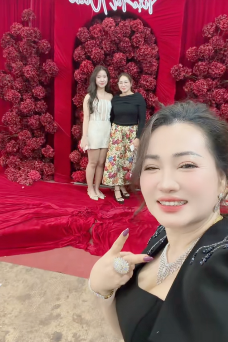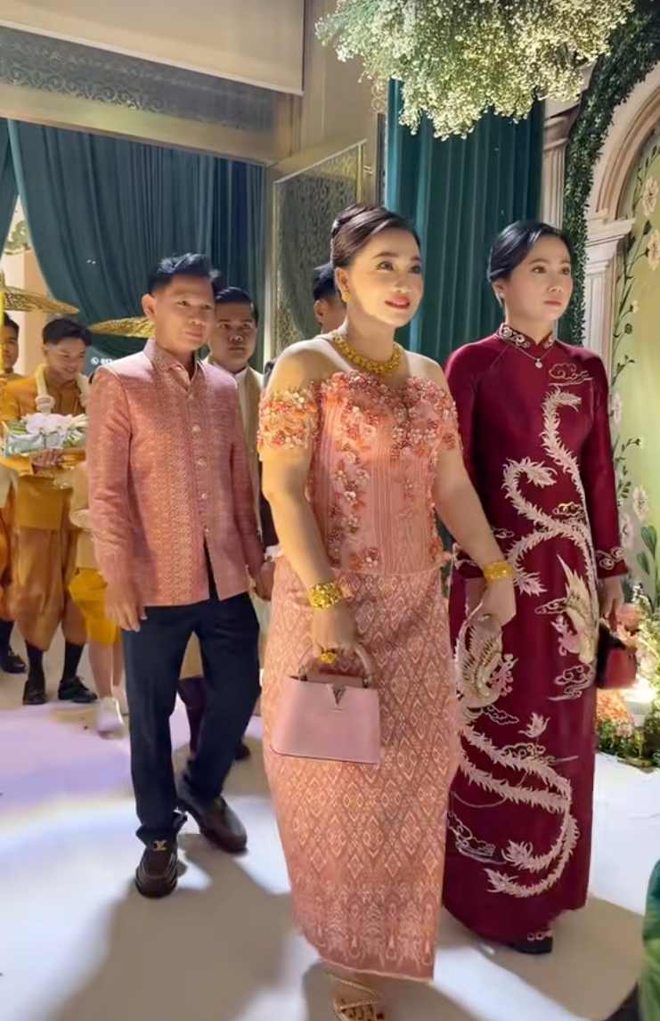 Trong ngày trọng đại, hình ảnh hai bên thông gia xuất hiện trong trang phục truyền thống của mỗi quốc gia cũng trở thành điểm nhấn đầy ý nghĩa. Mẹ cô dâu diện áo dài đỏ truyền thống của Việt Nam - gam màu tượng trưng cho hỷ sự, phúc lộc và sự viên mãn, toát lên vẻ nền nã, sang trọng đúng chuẩn người mẹ trong ngày con gái xuất giá. Trong khi đó, mẹ chú rể lại lựa chọn trang phục truyền thống của người Campuchia, mang đậm dấu ấn văn hóa bản địa.
