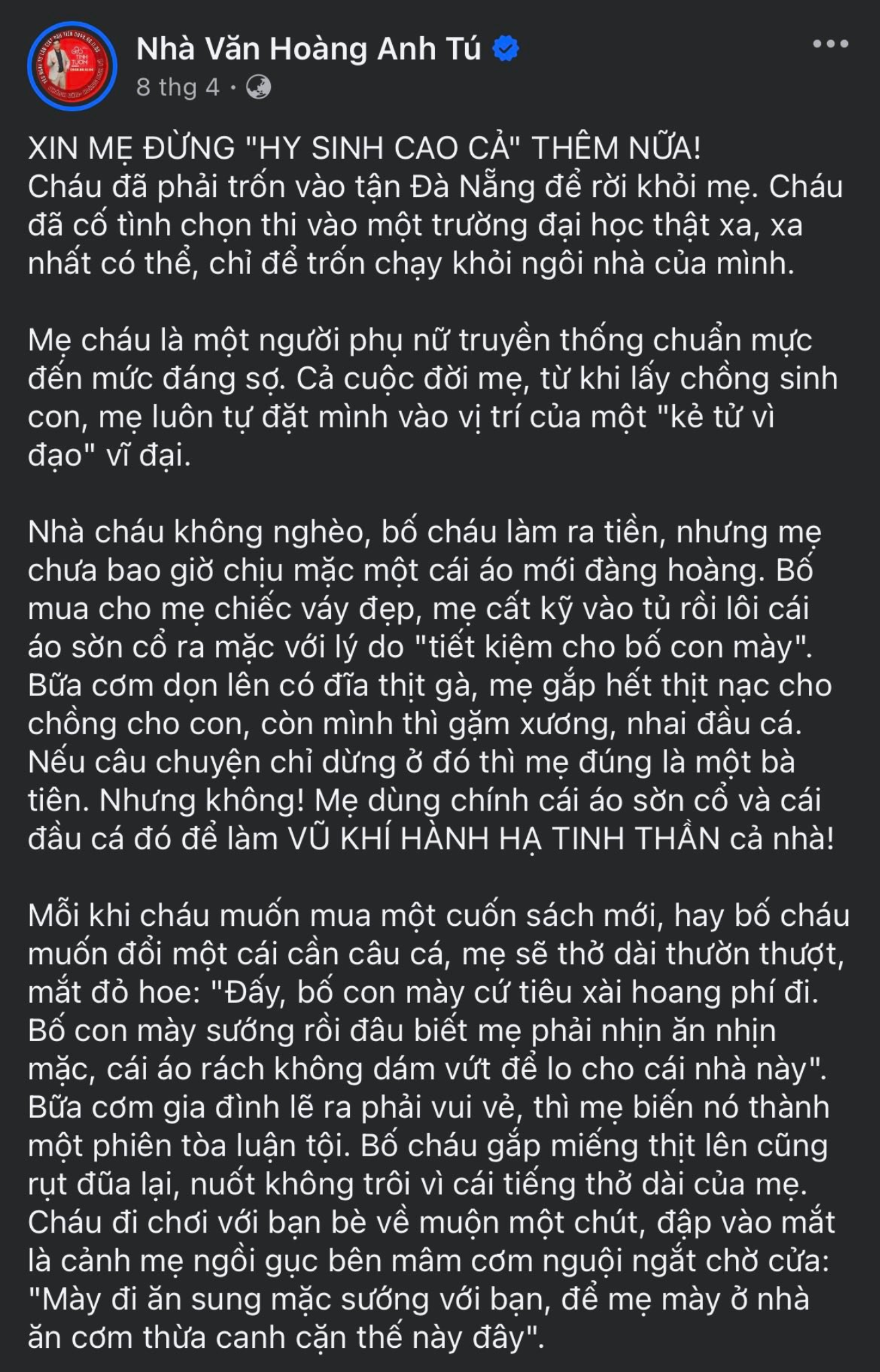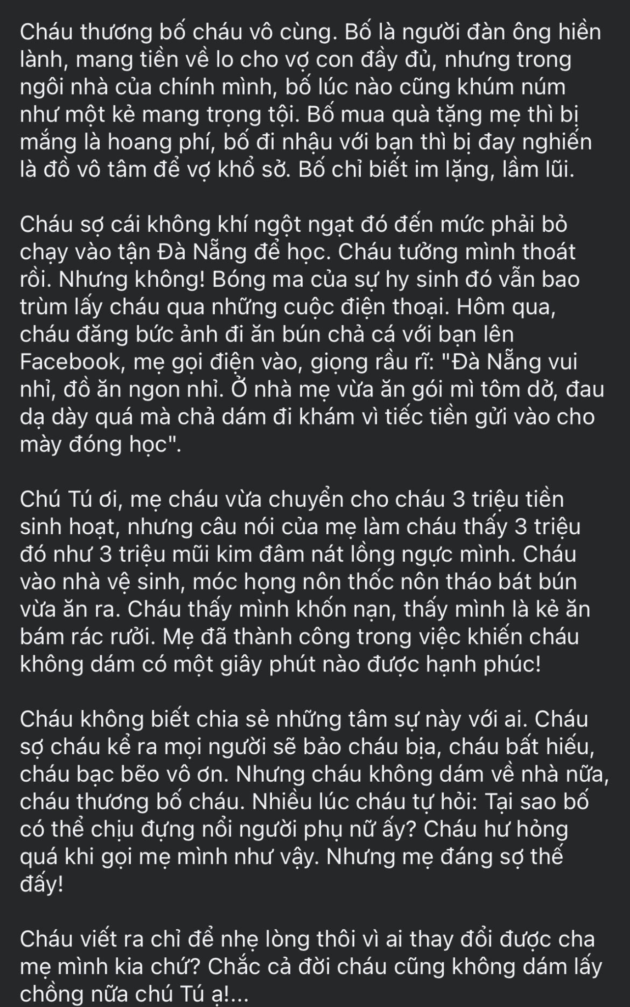 Bạn trẻ ấy kể rằng mình đã phải chọn học đại học thật xa, tận Đà Nẵng, chỉ để rời khỏi ngôi nhà của chính mình. Một ngôi nhà không nghèo, bố là người kiếm tiền đầy đủ, nhưng lại luôn phủ kín bởi bầu không khí nặng nề.