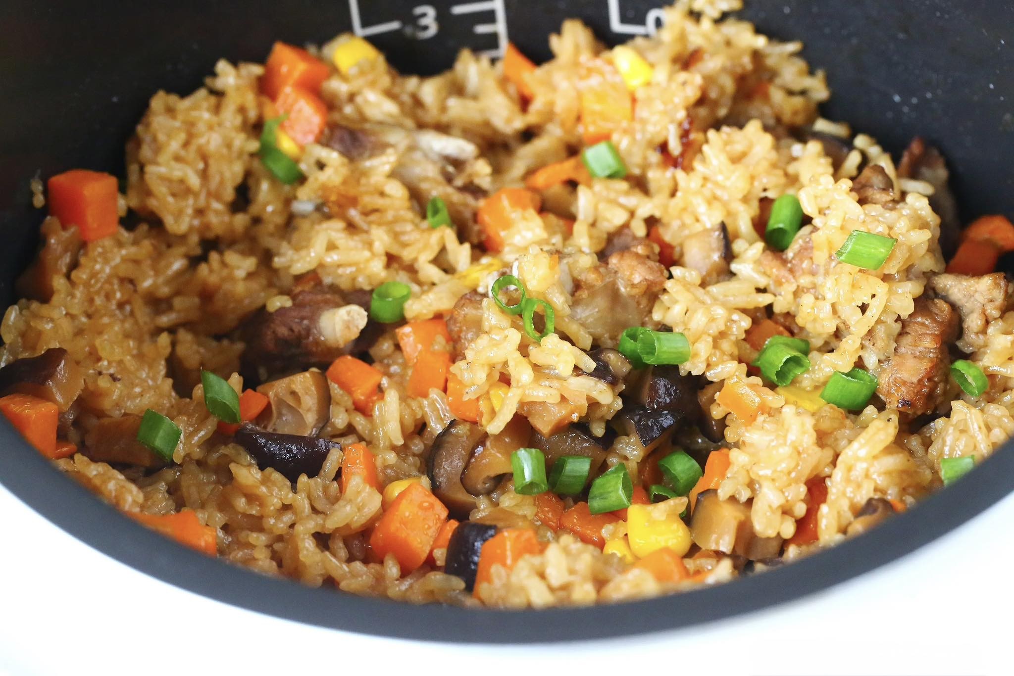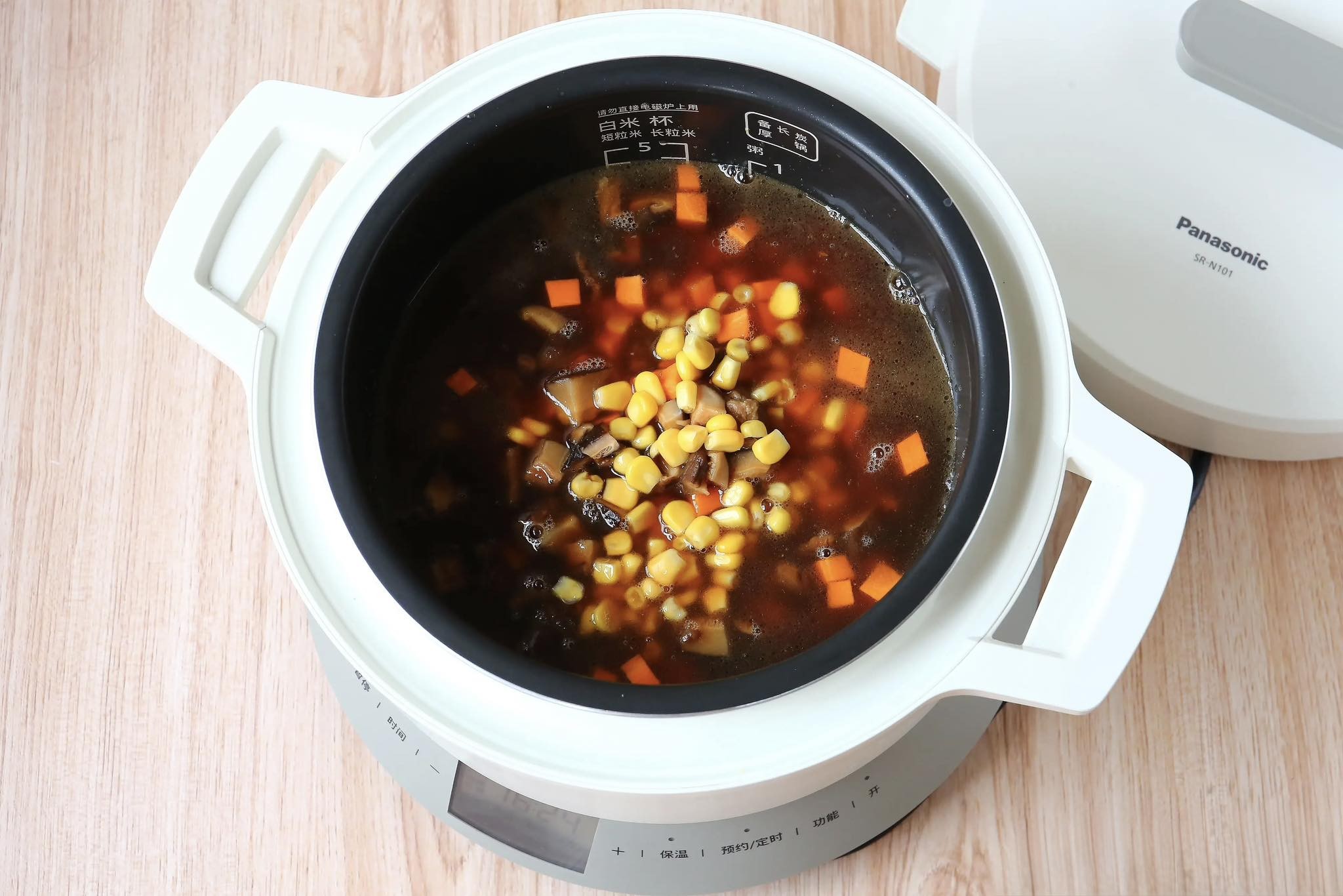 Bước 3: Thêm nấm hương và cà rốt thái hạt lựu cùng hạt ngô vào. Tiếp đó chọn chế độ "Nấu chín kỹ" và nhấn công tắc để bắt đầu nấu cơm. Sau khi cơm chín, bạn cần đảo đều bằng đũa hoặc phới dẹt để các nguyên liệu được trộn đều. Sau đó rắc một chút hành lá thái nhỏ vào, lấy ra đĩa hoặc bát tô nhỏ đặt lên bàn ăn và cùng gia đình thưởng thức. Trước khi lấy ra bát,Món này rất tuyệt khi trời se lạnh.