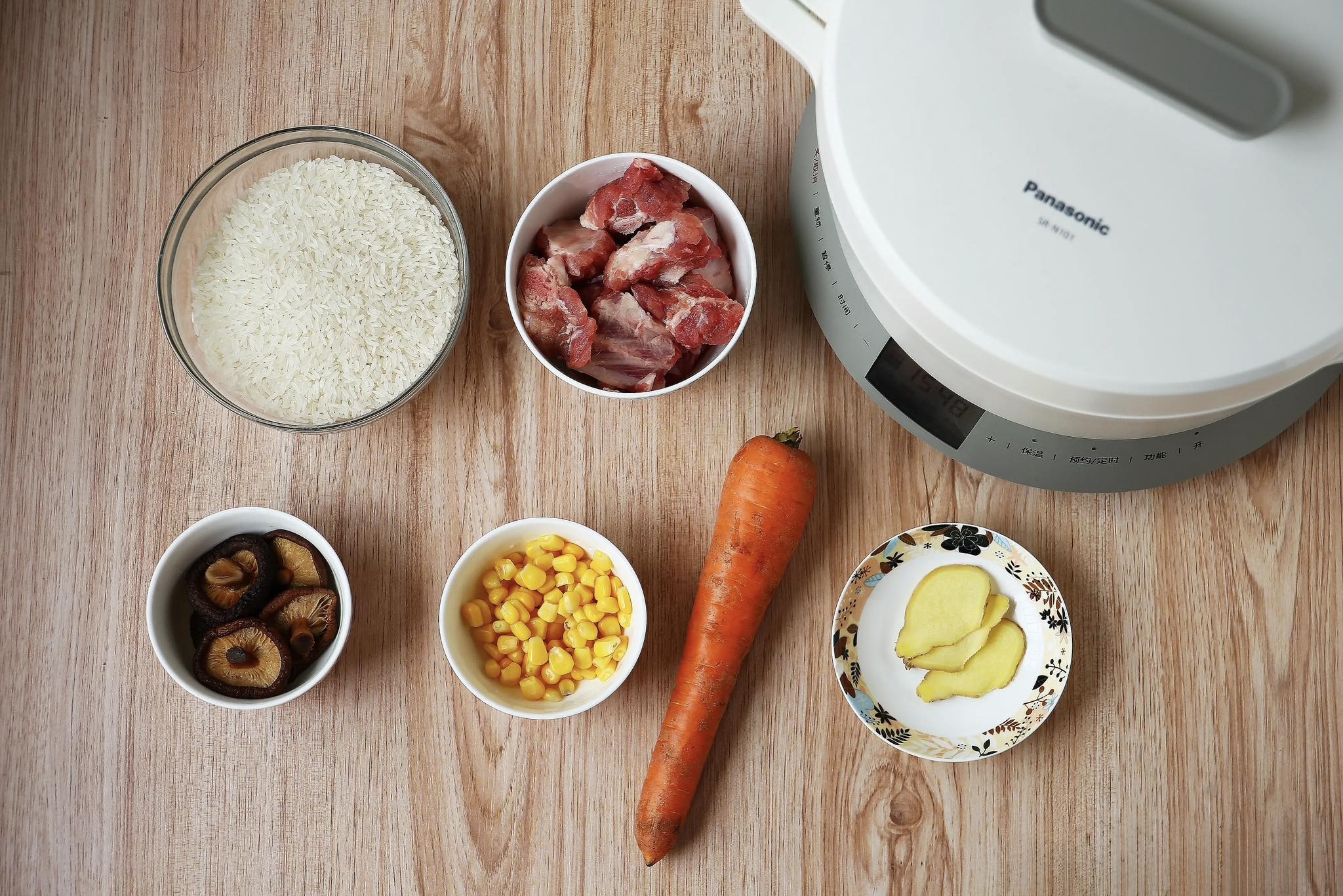 Nguyên liệu chính: 200g sườn heo, 300g gạo, 5 cây nấm hương đã ngâm nở, 1 củ cà rốt, 30g hạt ngô ngọt, 3 lát gừng, một ít hành lá thái nhỏ.