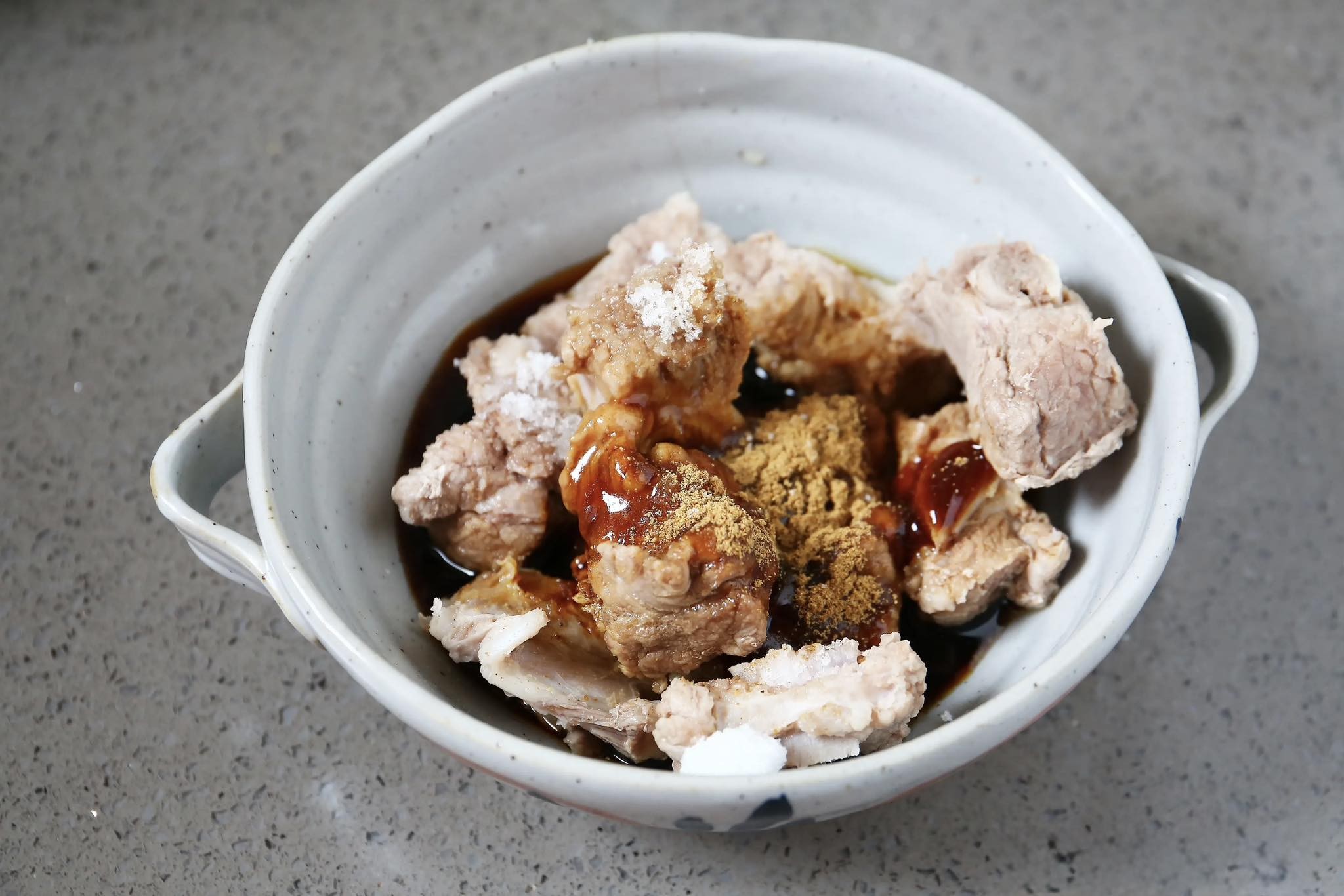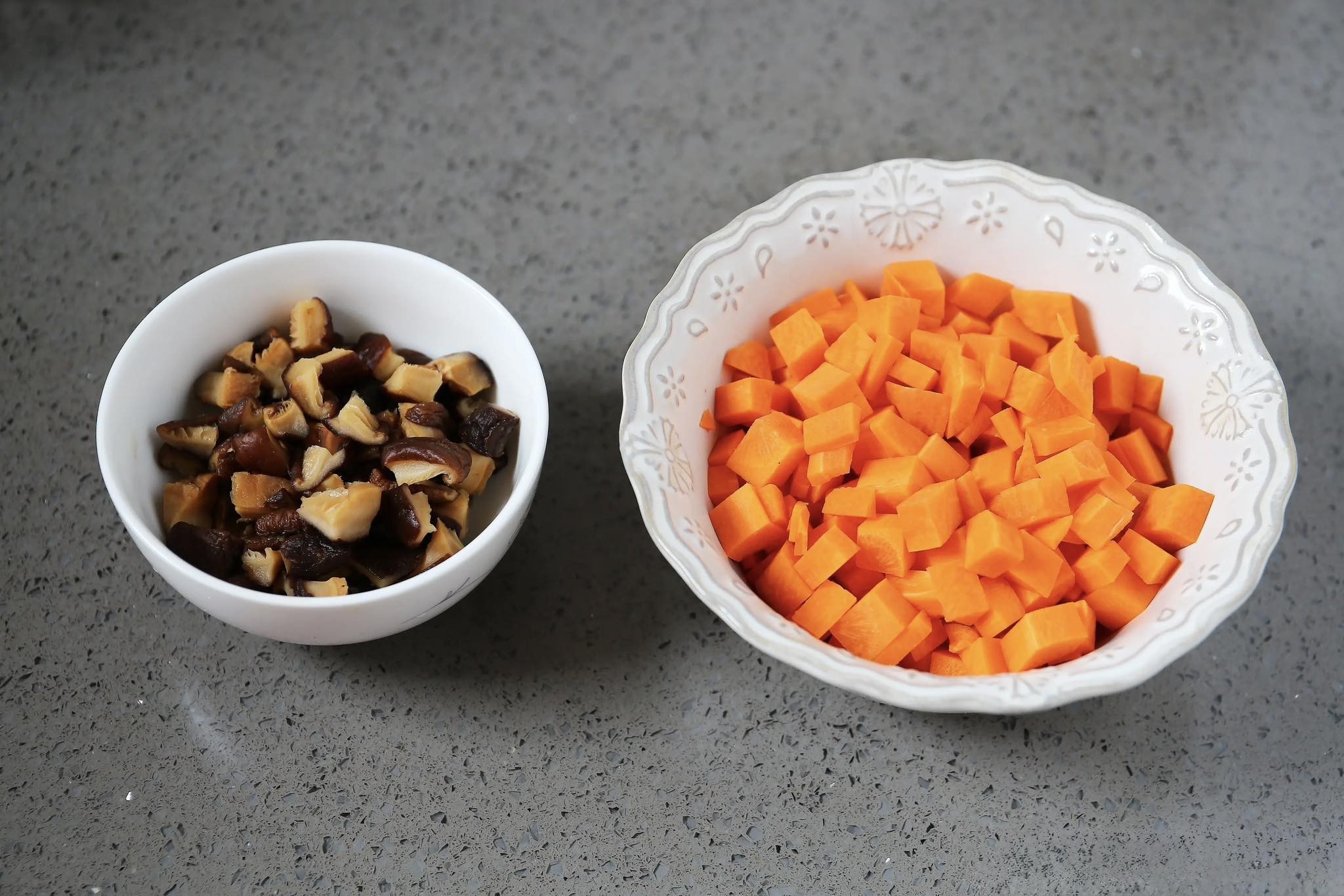 Bước 1: Cà rốt gọt bỏ vỏ, rửa sạch và cắt thành dạng hạt lựu. Cắt nhỏ nấm hương đã ngâm. Cho sườn heo đã rửa sạch vào nồi nước rồi bật bếp để chần. Khi nước sôi, vớt hết bọt bẩn rồi vớt ra, rửa sạch lại bằng nước ấm. Tiếp theo bạn cho các nguyên liệu gia vị vào, trộn đều và ướp trong khoảng 30 phút.