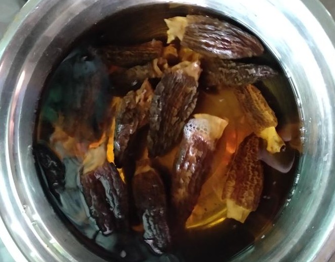Bước 1: Sau khi rửa sạch nấm bụng dê, ngâm chúng kỹ trong nước tinh khiết. Sau khi ngâm xong bạn đừng đổ nước đi, hãy để lắng lại rồi lọc để làm nước dùng nấm. Bong bóng cá bạn ngâm cho đến khi nở mềm. Tiếp đó cho bong bóng cá vào nồi, thêm hai lát gừng rồi chần sơ, sau đó vớt ra để riêng.