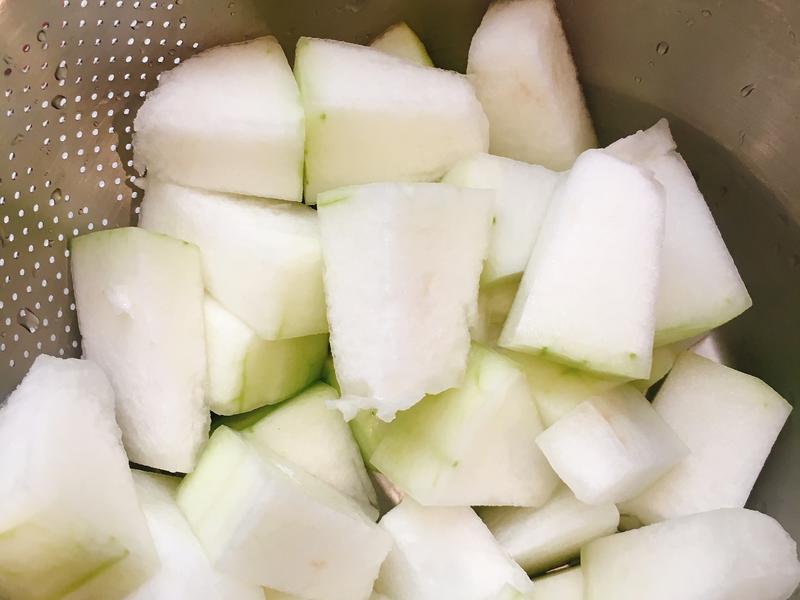 Bước 1: Đầu tiên, rửa sạch rồi chặt sườn heo thành các miếng nhỏ. Sau đó ngâm sườn heo trong nước có pha một ít muối khoảng nửa tiếng, sau đó rửa sạch và để ráo nước. Cho nước vào nồi, thêm sườn và 1 thìa cà phê rượu nấu ăn, chần khoảng 3 phút, sau đó vớt ra, rửa sạch lại với nước ấm, để ráo. Cắt ngô thành từng đoạn nhỏ khoảng 4cm, và cắt bí đao thành từng miếng.