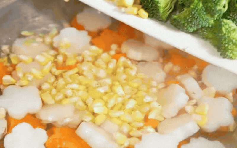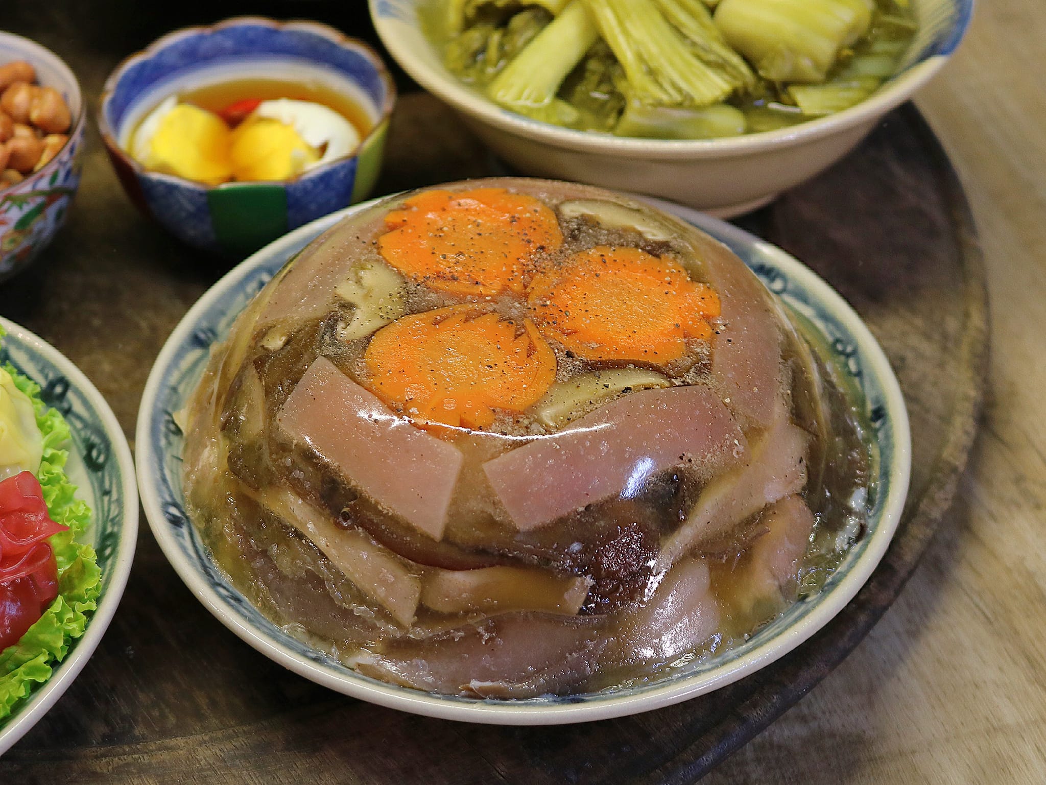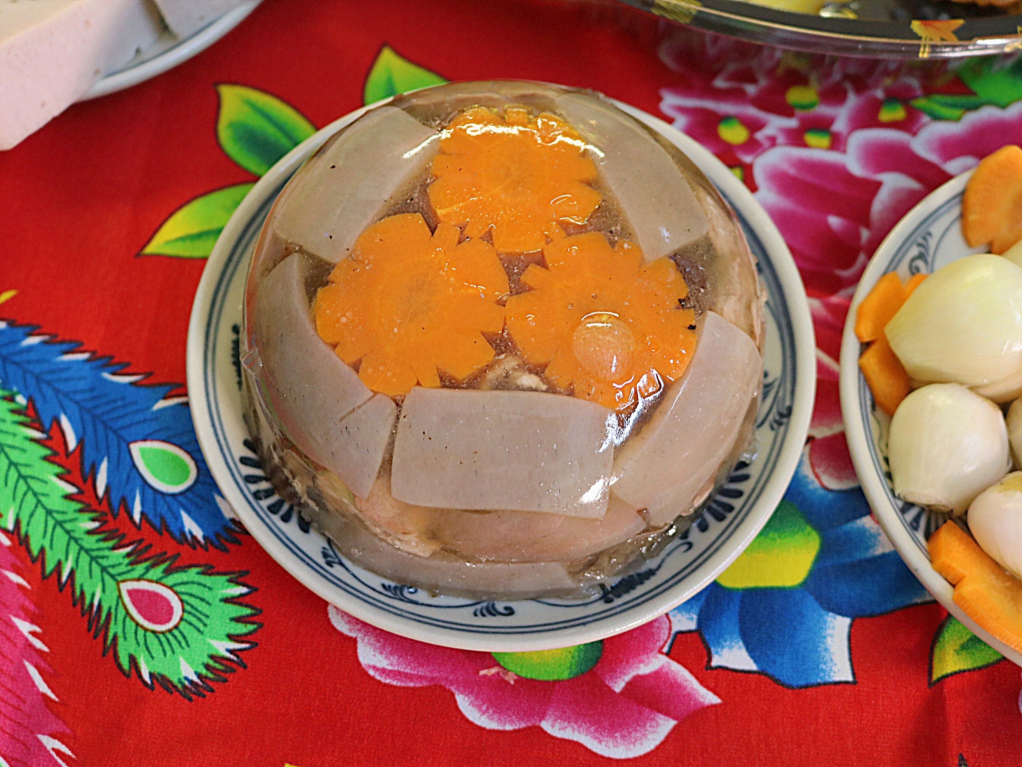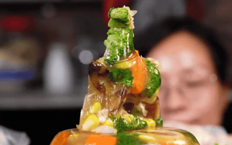 Món thịt đông hiện đại không còn đơn điệu một màu nâu trầm của mộc nhĩ. Nó rực rỡ sắc màu của rau củ, như mang cả mùa xuân vào trong khuôn thạch. Cà rốt đỏ cam, bông cải xanh mướt, bắp vàng ươm... tất cả được tỉa tót thành hình hoa, hình lá, được luộc riêng rồi ngâm qua nước lạnh để giữ trọn màu sắc tươi nguyên. Chính những nguyên liệu này làm cân bằng vị giác, khiến miếng thịt đông trở nên thanh mát, nhẹ bụng hơn rất nhiều cho những ngày Tết nạp quá nhiều đạm.