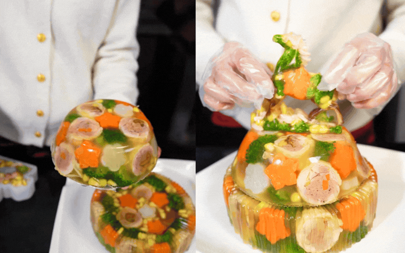 Công đoạn cuối cùng của việc làm thịt đông giống như một nghi thức nghệ thuật. Người nấu lọc nước hầm qua rây cho thật trong, loại bỏ hết cặn bã. Sau đó, xếp rau củ đã tỉa hoa xuống đáy khuôn, đặt những khoanh gà cuộn tròn xinh xắn lên trên, rồi nhẹ nhàng rót ngập thứ nước dùng sóng sánh ấy vào.