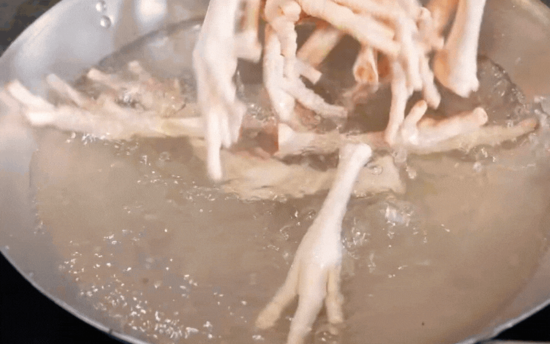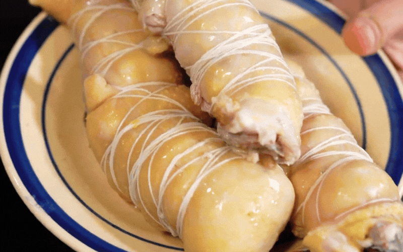 Và linh hồn của món ăn, chất keo tạo đông không cần dùng đến gói bột gelatin công nghiệp nào cả, mà đến từ chính những chiếc chân gà. Chân gà làm sạch, bóp kỹ với chanh muối để khử mùi, rồi được hầm kỹ cùng hành và gừng nướng thơm lừng. Cái sự kỳ công của người nấu nằm ở chỗ canh lửa. Gà cuộn thì nhanh chín, chỉ chừng nửa tiếng là vớt ra để giữ độ ngọt và dai giòn. Còn chân gà thì phải hầm tiếp, hầm cho đến khi mềm rục, tiết ra hết chất nhựa dẻo quánh, tạo nên thứ nước dùng sánh vàng tự nhiên.