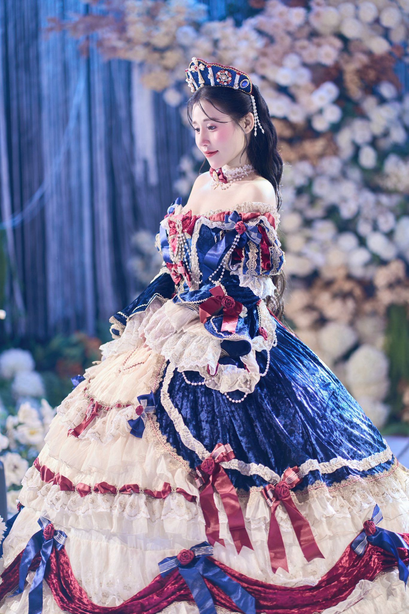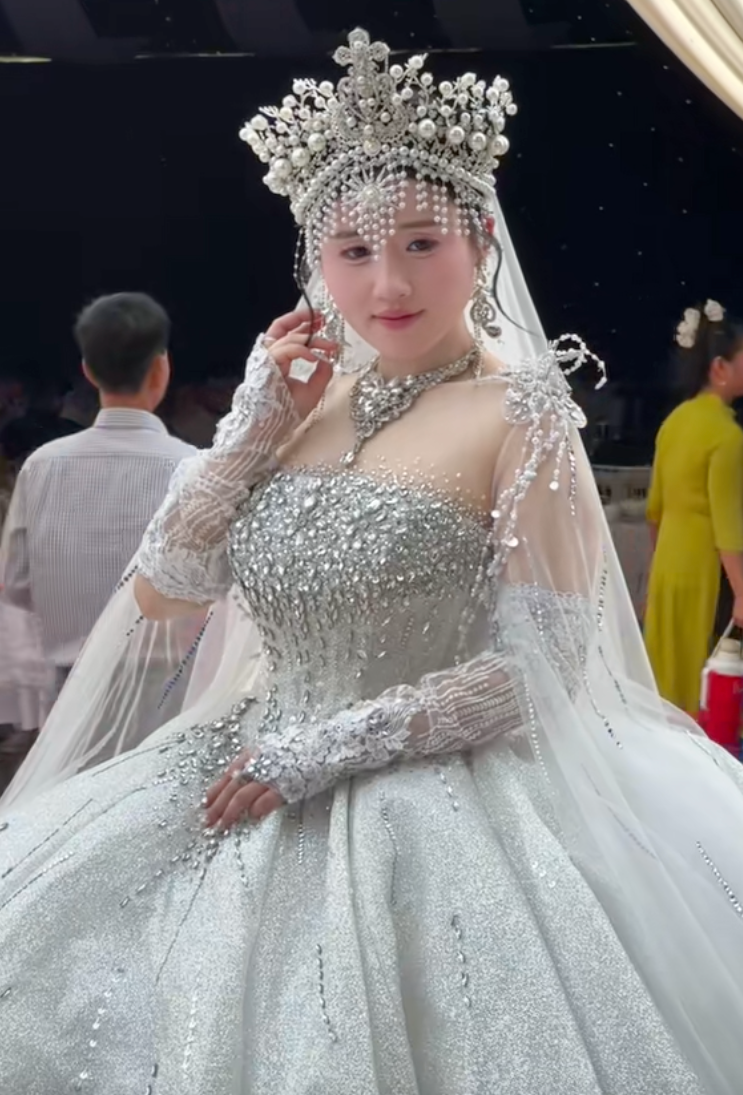 Chiếc vương miện lấp lánh, đồ sộ đến mức chỉ cần liếc nhìn cũng đủ khiến người đối diện choáng ngợp, tạo nên hình ảnh một "nữ hoàng" thực thụ trong ngày cưới của mình. Nhiều người còn ví von lễ cưới này như lễ "sắc phong vương hậu" với chiếc vương miện đồ sộ theo đúng nghĩa.
