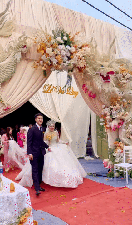 Gia đình nhà gái còn mạnh tay đầu tư không gian tổ chức lễ cưới vô cùng hoành tráng. Rạp cưới được dựng với diện tích lên tới khoảng 600m², thiết kế quy mô, sang trọng, tổng chi phí được tiết lộ vượt mốc 200 triệu đồng.