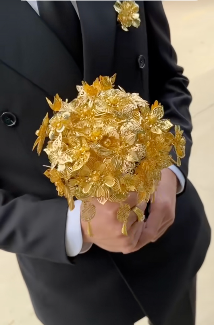 Chưa dừng lại ở đó, bó hoa cưới trên tay cô dâu cũng thuộc "đẳng cấp khác biệt". Thay vì những bó hoa tươi rực rỡ quen thuộc, cô dâu hot nhất Phú Thọ lựa chọn một bó hoa cưới bằng vàng, lấp lánh và xa xỉ. Ngay cả hoa cài áo của chú rể cũng được chế tác từ vàng, đồng bộ và tinh tế.